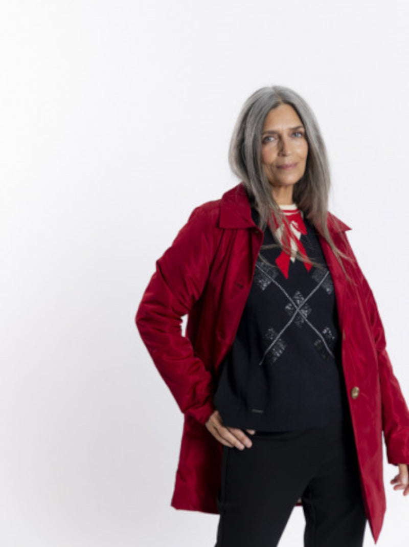 Gabardina Trench acolchada BMB & Co color GRANATE confeccionada en tejido WATERPROOF. Cuello con solapas. Bolsillos delanteros. Cierre mediante botones. Mini abertura en la parte trasera. Largura total desde el hombro de 83cms (para Talla 36).