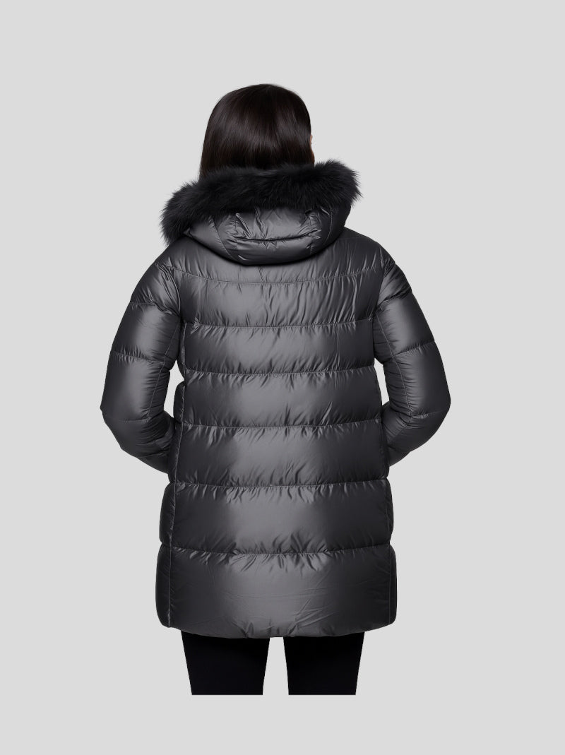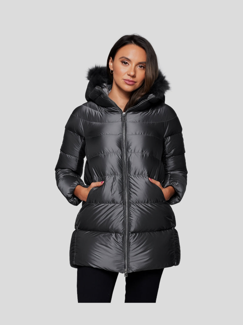 Plumífero mujer HETREGÓ modelo HANNA color GRIS CENIZA confeccionado en nailon 20 deniers ultra resistente al agua con una superficie brillante y refinada, ligero y de tacto sedoso. Lleva capucha desmontable con pelo natural al tono. Cierre por cremallera