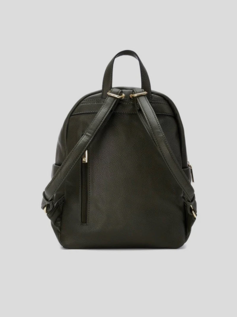 Mochila de CARMELA color KAKI en serraje frontal y resto en piel sintética con detalles metálicos dorados. Dispone de hasta 7 bolsillos: uno principal con cremallera, uno frontal con cierre magnético, dos laterales y uno trasero con cremallera.