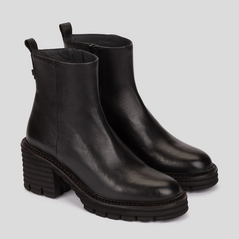Botín extraligero de PEDRO MIRALLES en piel lisa lotus color NEGRO con cremallera lateral interior y tirador trasero con logo metálico. Lleva suela de caucho EXTRALIGHT con detalle de relieves y tacón medio de 5cm. Plantilla y forro interior en piel.