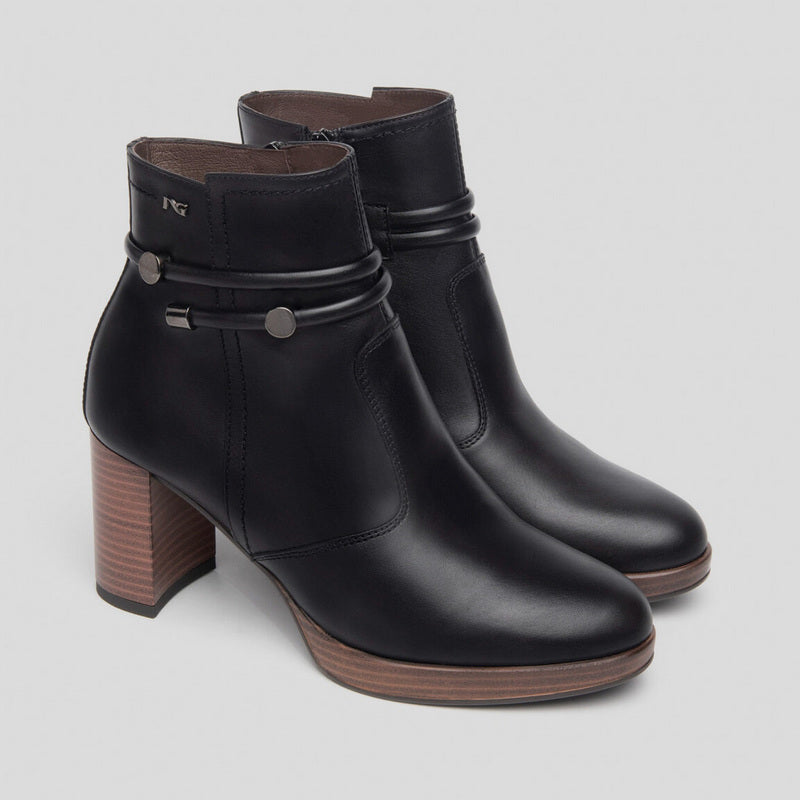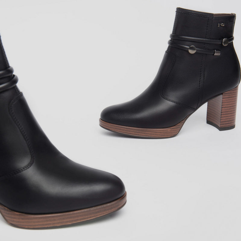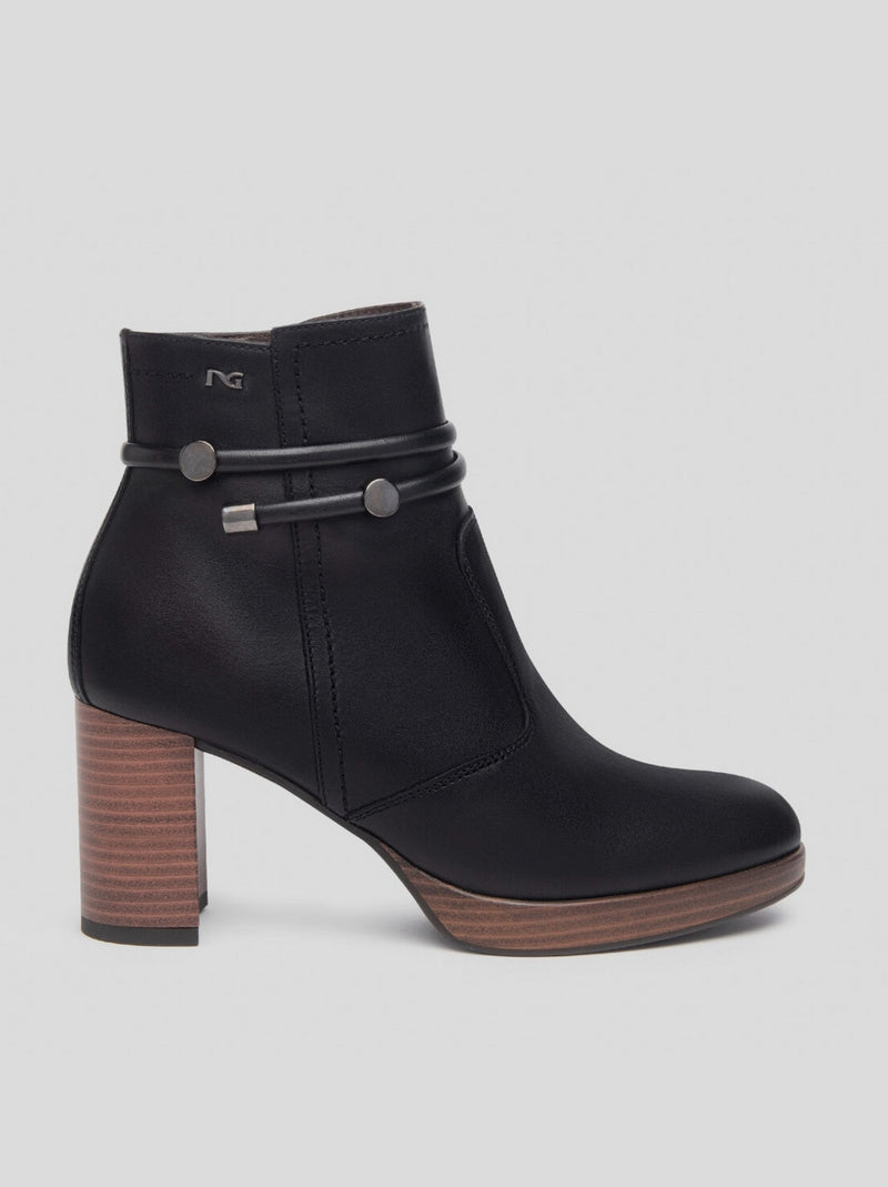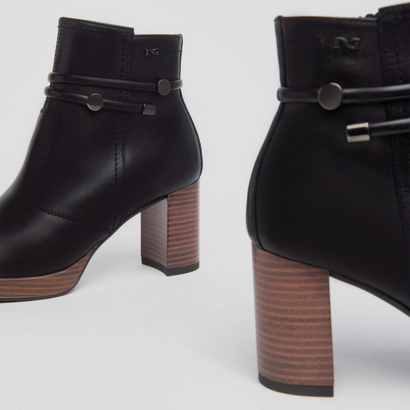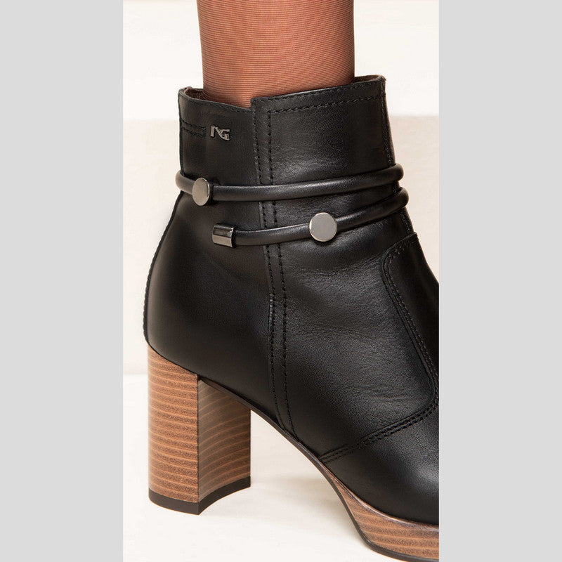 Botín de NERO GIARDINI en piel color NEGRO con detalle de tira decorativa estilo pulsera-cordón en la caña y cierre por cremallera en el lateral interior. Tacón de 7,5 cm y pequeña plataforma efecto madera. Plantilla de piel acolchada. Suela de goma.