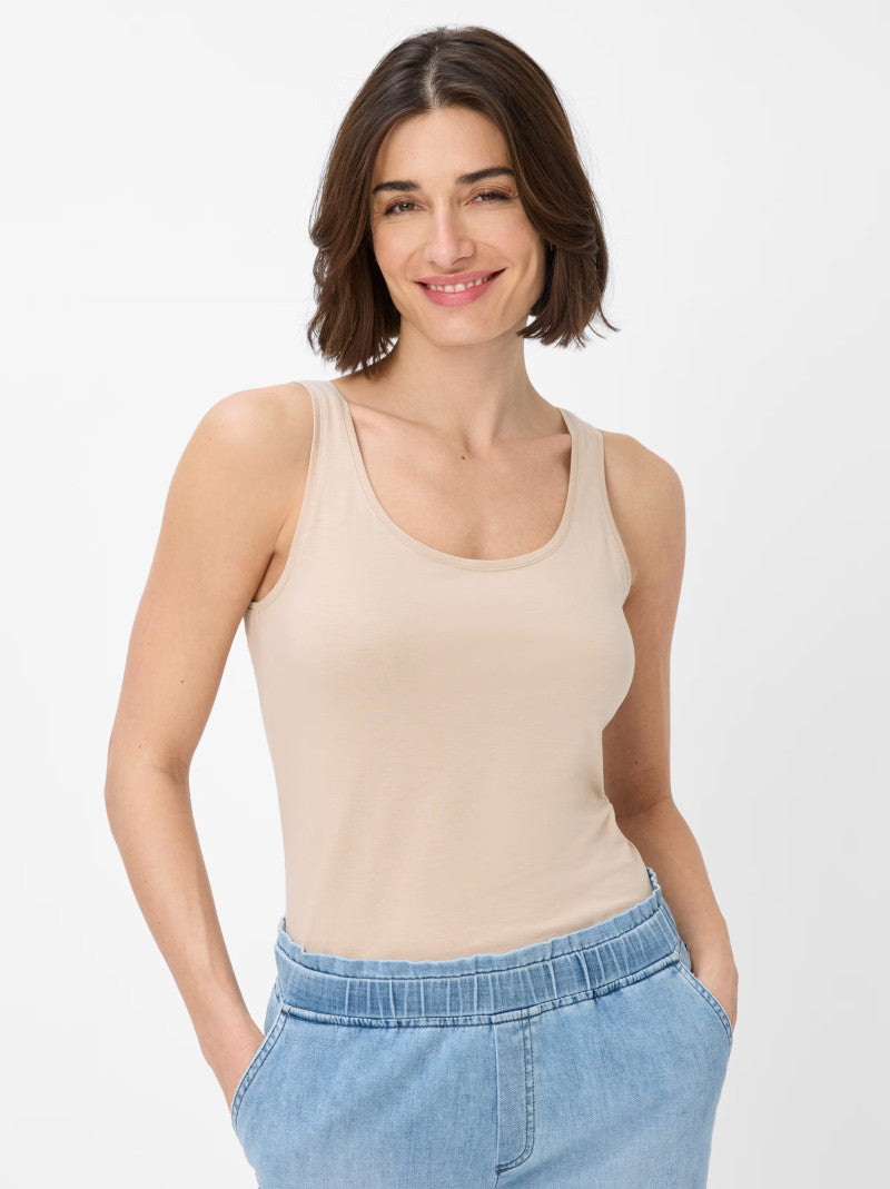 Camiseta tirantes de BRAX FEEL GOOD modelo SILVY en mezcla de algodón elástico color BEIGE. Cuello redondo ribeteado y silueta ajustada con tirantes estilo tanque. Perfecta para llevarla sóla o combinada bajo otra prenda.