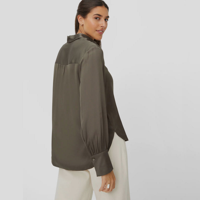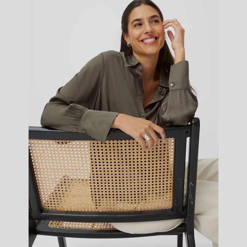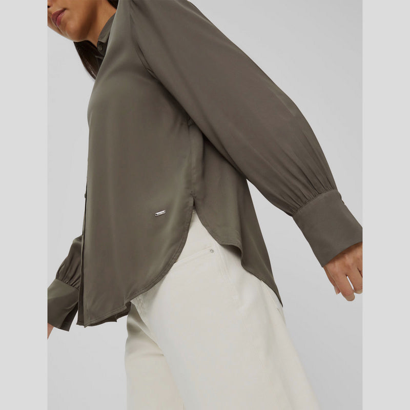 Camisa fluida estilo seda BRAX FEEL GOOD modelo VIC confeccionada en viscosa color VERDE KAKI. Cuello clásico con cierre frontal por botones y canesú trasero con plisados. Manga holgada con puño ligeramente afarolado con plisados y botón. Bajo redondeado.
