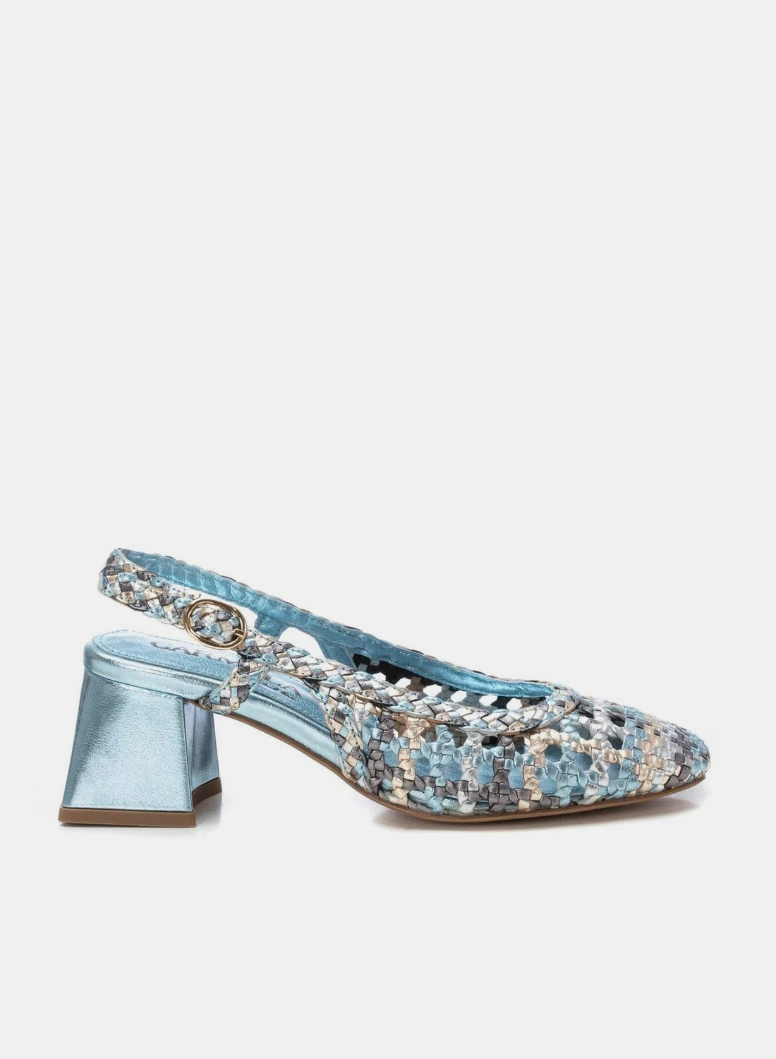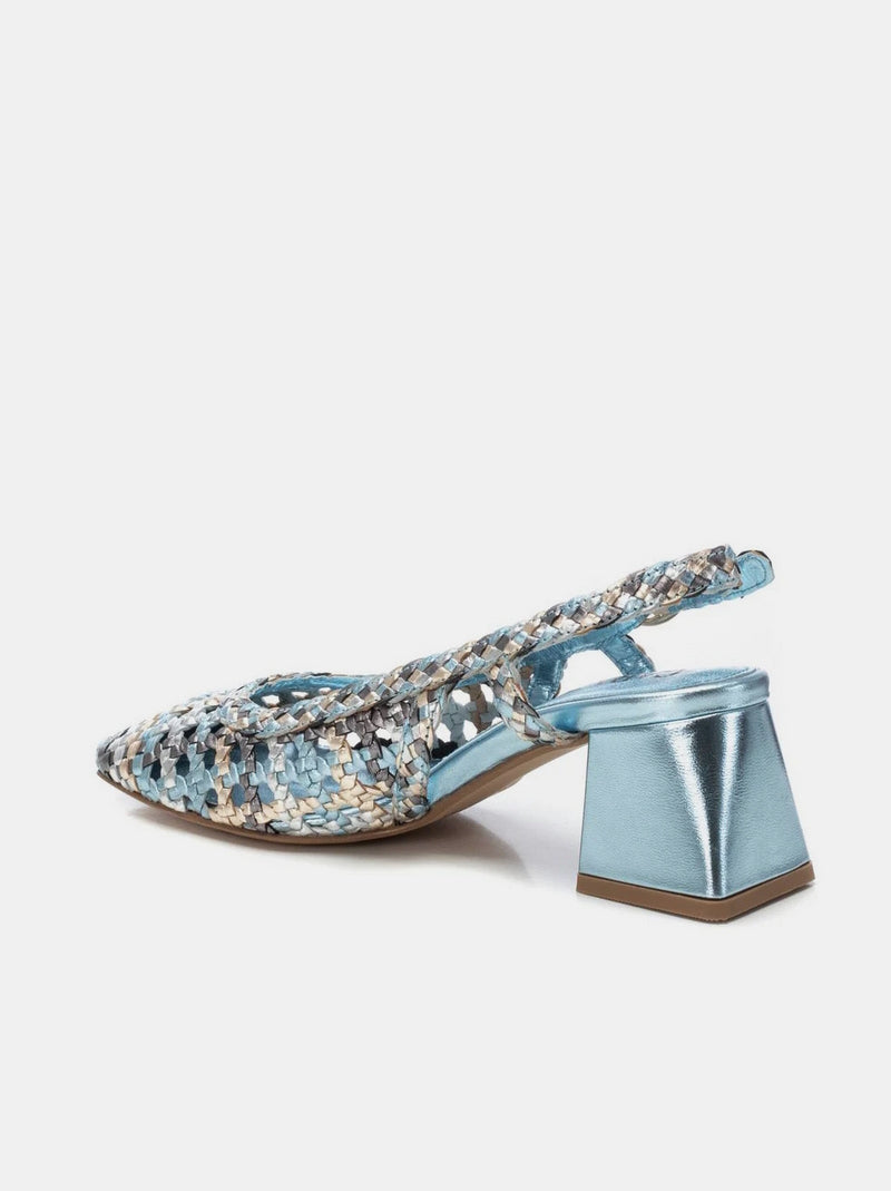 Salón punta cuadrada destalonado CARMELA en piel trenzada combinando tonos metalizados AZULES, ORO y PLATA. Ajuste por tira de tobillo con hebilla y elástico. Plantilla de piel acolchada. Suela de cuerolite con tacón ancho de 6 cm forrado de piel al tono.