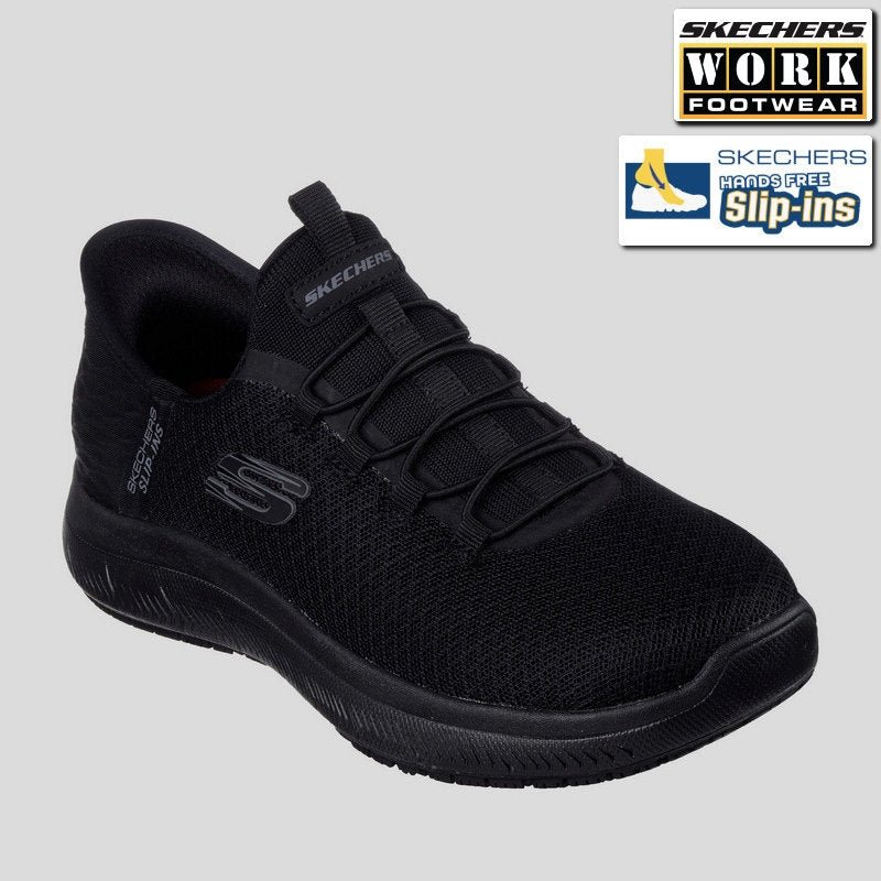 Deportiva mujer con elásticos SKECHERS HANDS FREE SLIP-INS® de la línea de trabajo WORK SR color NEGRO. Parte superior de malla con tratamiento REPEL WELL para proteger de líquidos, aceites y manchas. Suela antideslizante PERFECTA PARA EL TRABAJO.