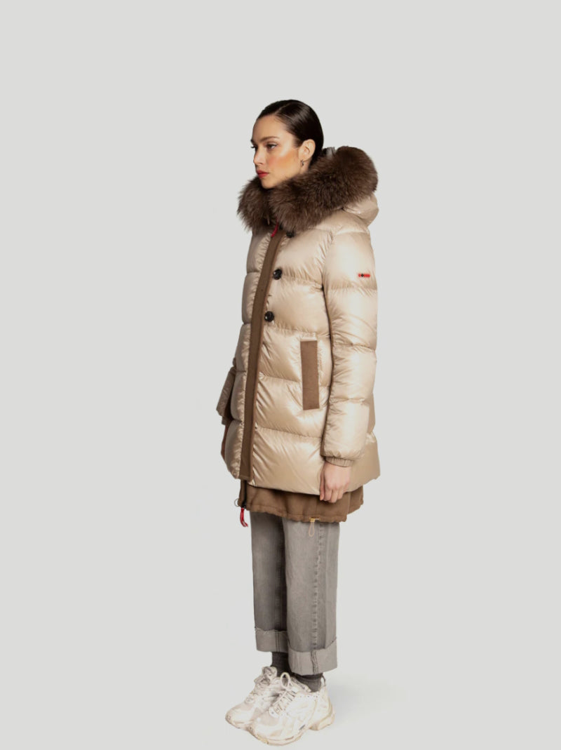 Plumífero DICHI modelo SAKARI que combina tejido brillo BEIGE con piezas en LANA estilo trenca. Capucha con pelo desmontable. Cierre por cremallera, corchetes y botones. Aberturas laterales con corchetes. Bajo inferior efecto doble tejido de lana.