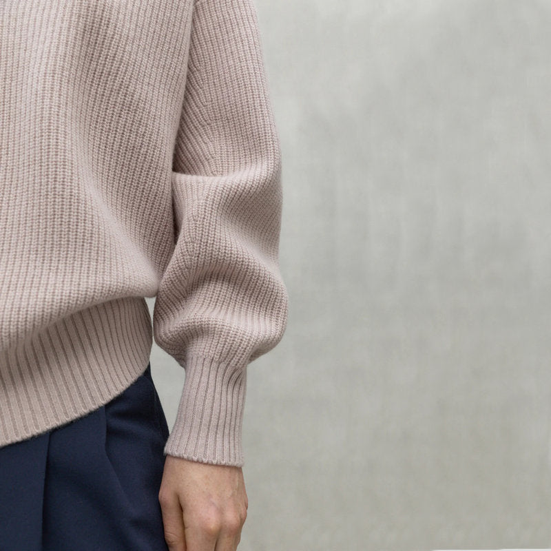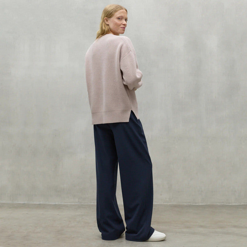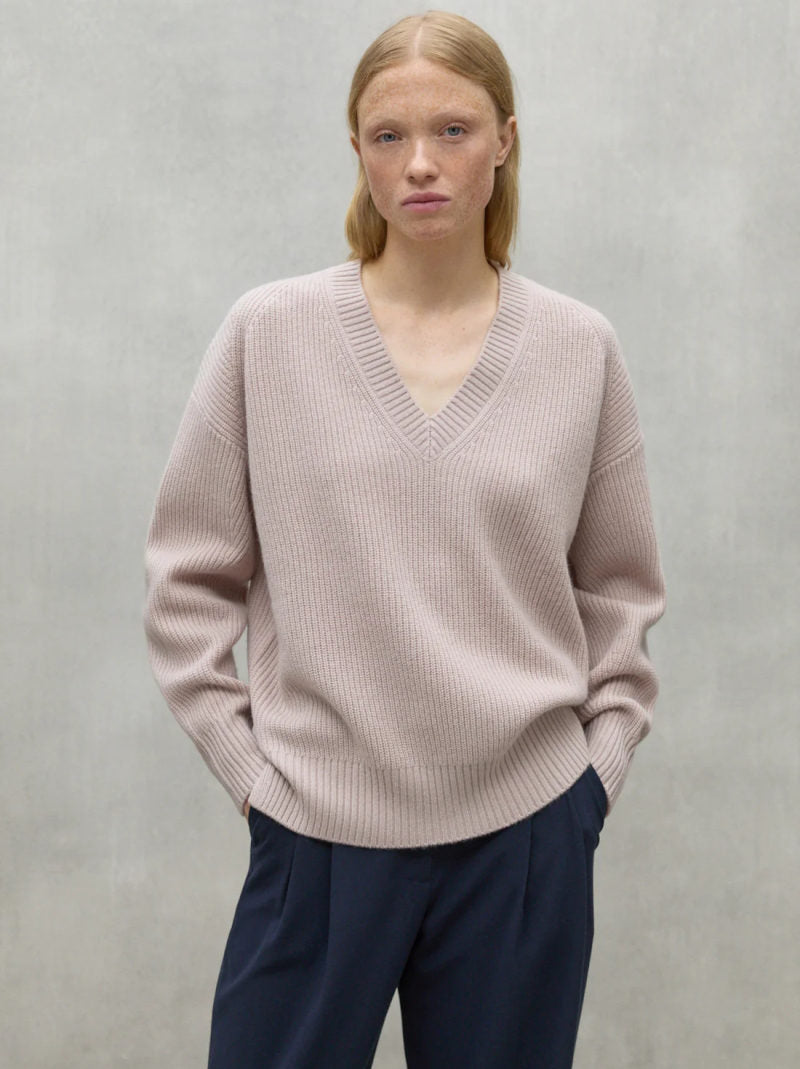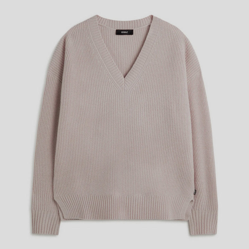 Jersey en pico de ECOALF modelo AZALEA color MALVA CLARO confeccionado 100% en LANA RECICLADA. Corte holgado con hombros caídos, cuello en pico y manga larga. Cuello, puños y bajo en canalé. Detalle de aberturas laterales en el bajo.