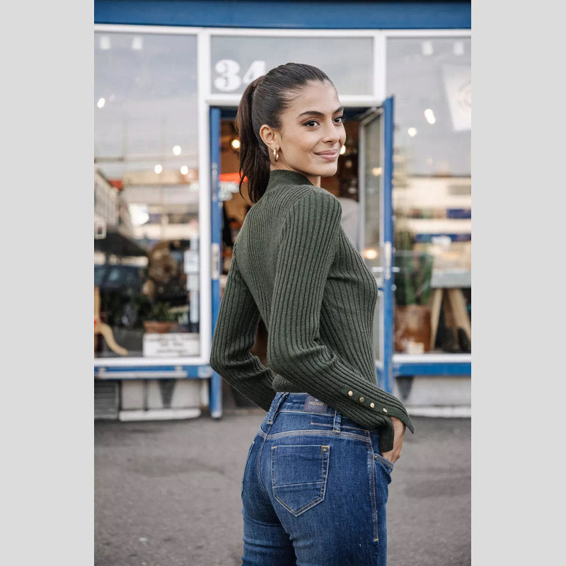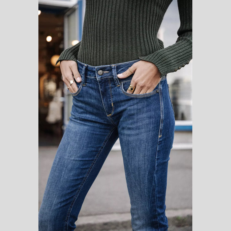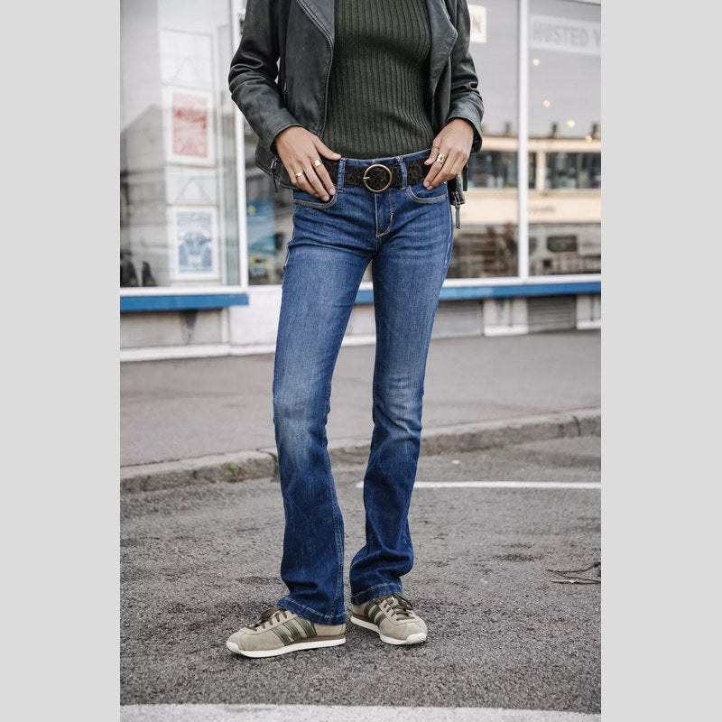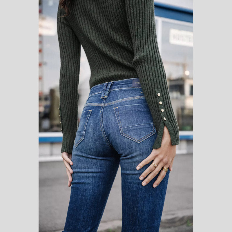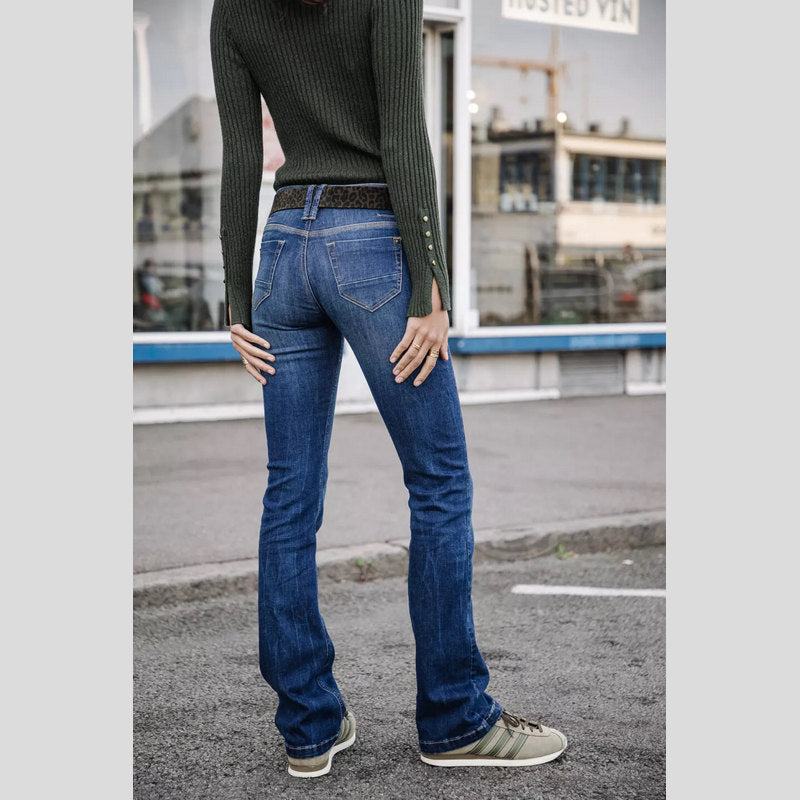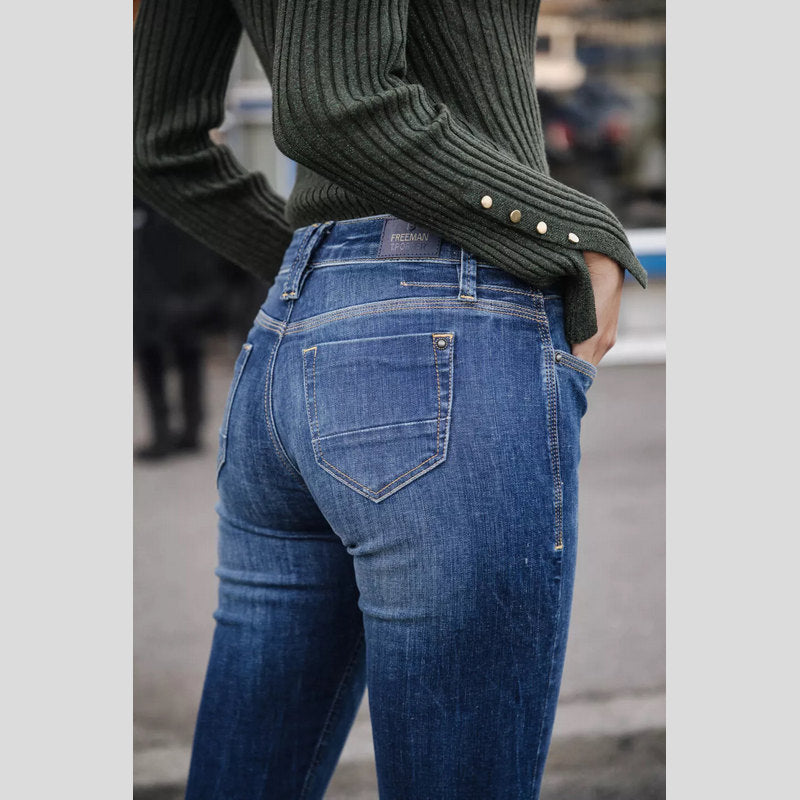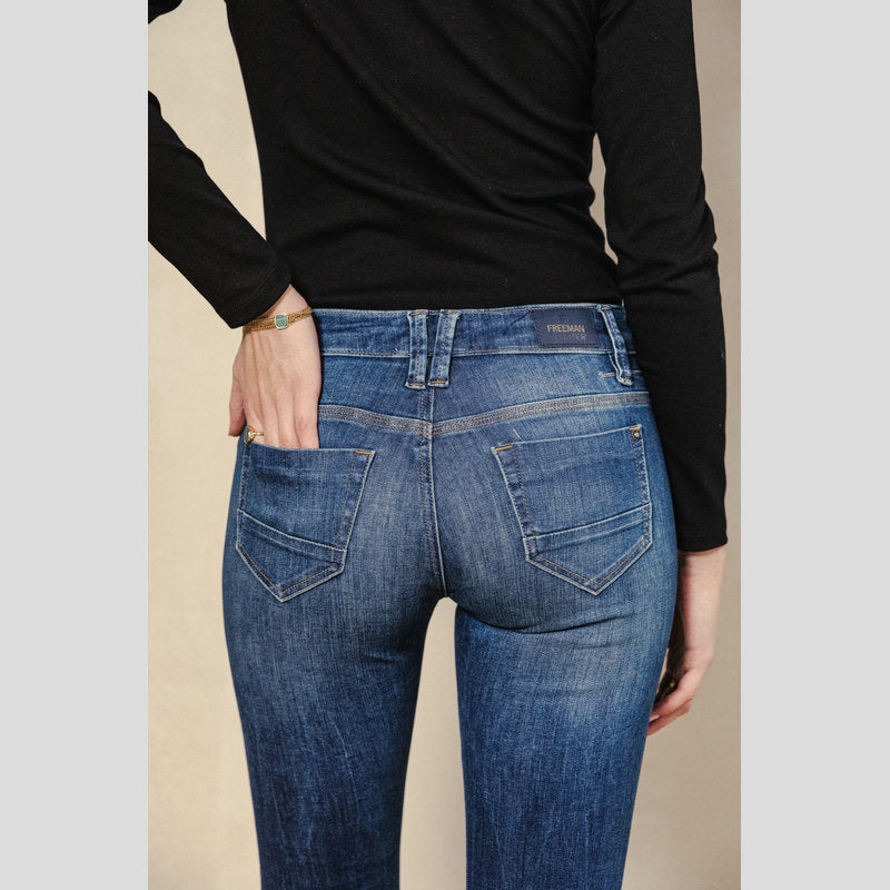 Vaquero BETSY S-SDM de FREEMAN T.PORTER en tejido denim superelástico color lavado AZUL OSCURO. Vaquero corte BOOTCUT ajustados en el muslo y ligeramente acampanados desde la rodilla con cintura regular. Cuatro bolsillos. Cierre por botón y cremallera.