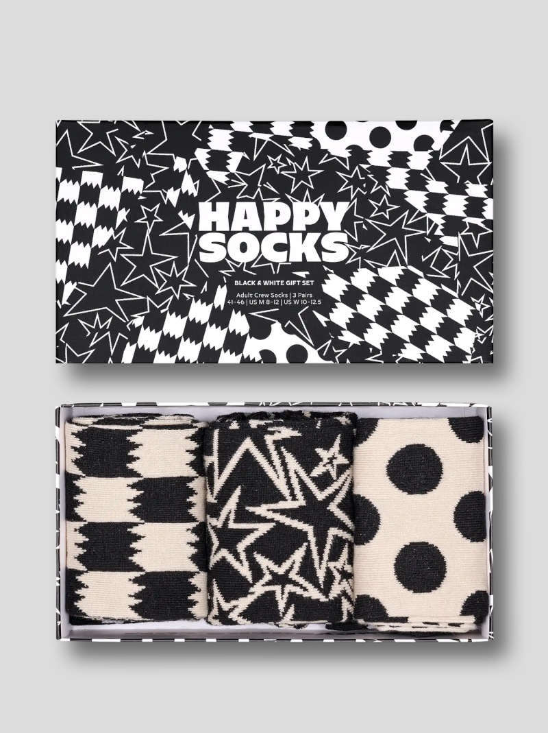 Caja de calcetines HAPPY SOCKS mezcla de algodón orgánico peinado modelo 3-PACK BLACK & WITE GIFT SET con talón y dedo del pie reforzados. Esta caja contiene tres modelos distintos con motivos geométricos en tonalidades monocromo perfectos para combinar.