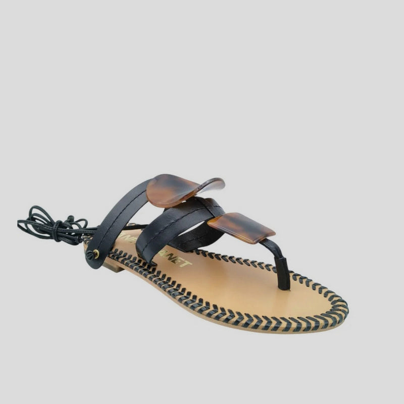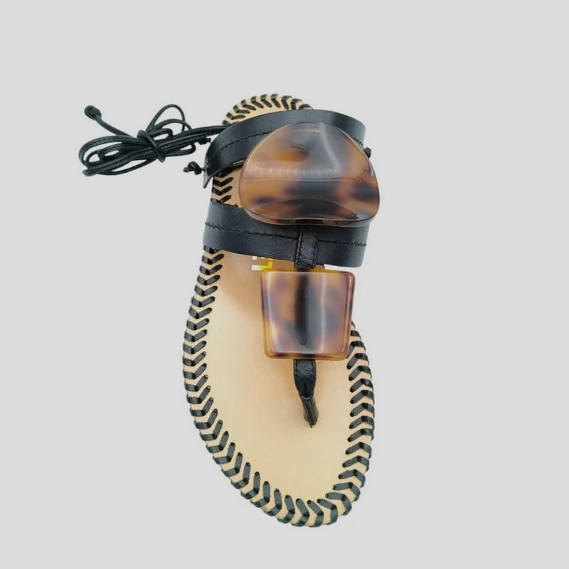 Sandalia plana de JANET&JANET estilo romana en piel color NEGRO con mega detalles de resina de carey en el empeine. Ajuste por cordones para atar alrededor del tobillo o de la pierna. Plantilla de piel con detalles de costuras. Suela de goma cuerolite.