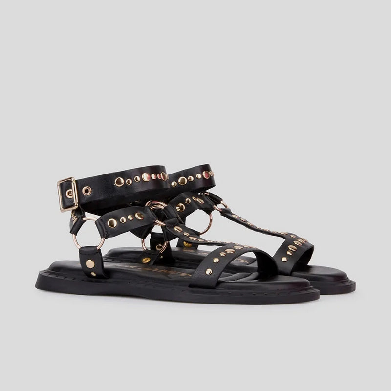 Sandalia plana estilo romana de JANET&JANET en piel NEGRA con tiras decoradas con tachas y aros dorados. Cierre con hebilla en la tira de tobillo. Plantilla de piel acolchada. Suela de goma antideslizante.