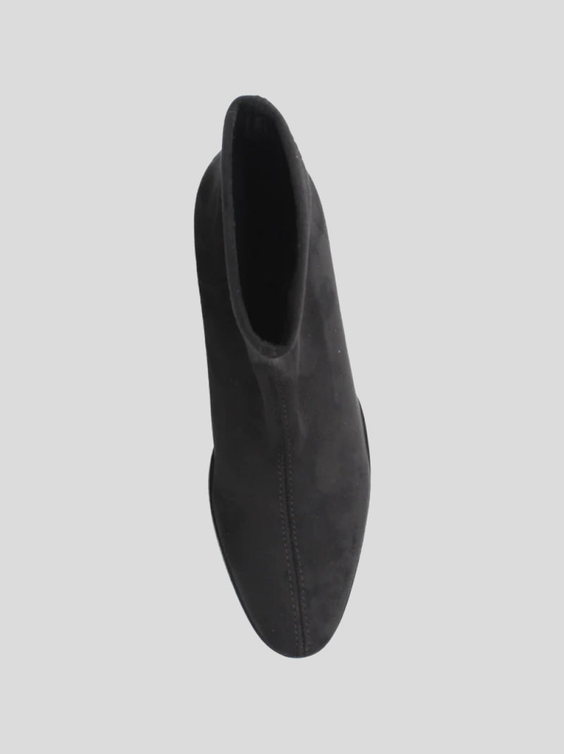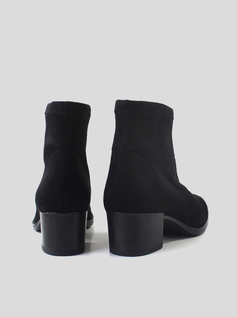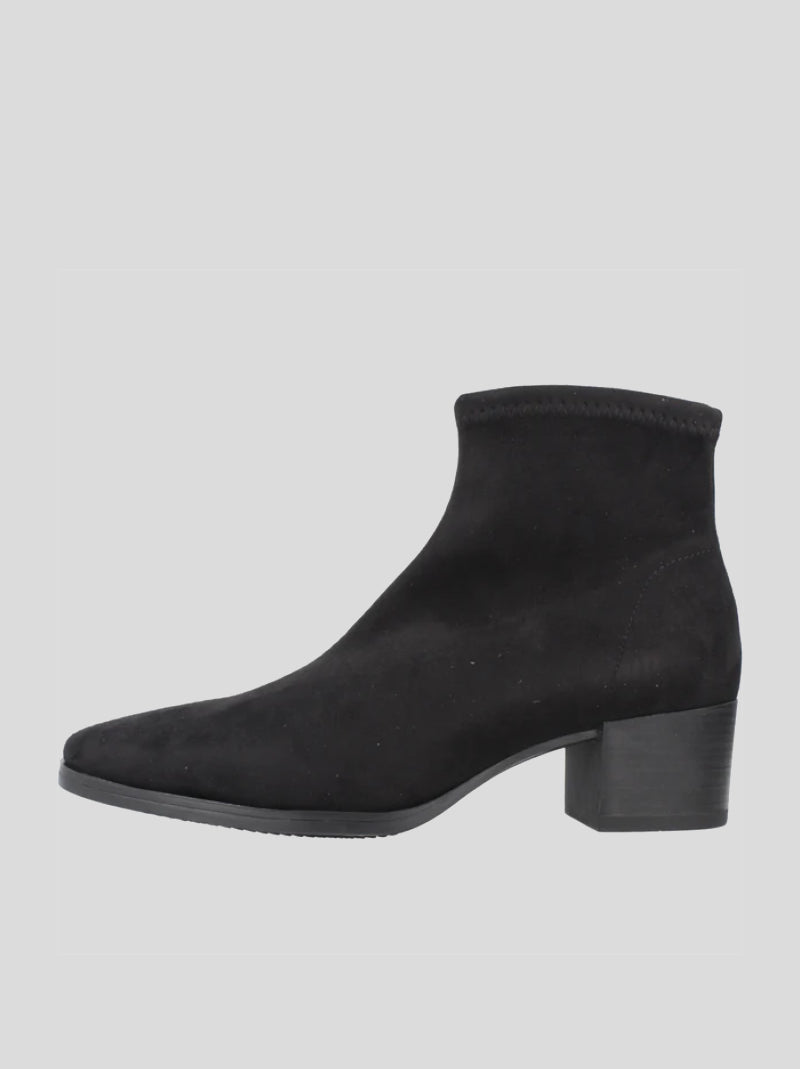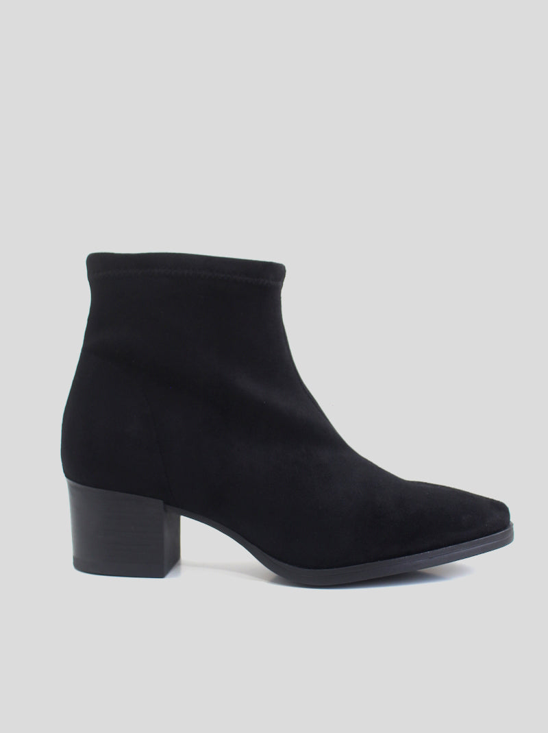 Botín MISS ELASTIC fabricado en ante strech ECO-ELÁSTICO e impermeable ECO-DRY color NEGRO. Punta redonda, tacón cuadrado de 5 cm de altura. Plantilla y forro Biogel SANI TEX: transpirable, antibacteriana y resistente al mal olor. Suela de goma.