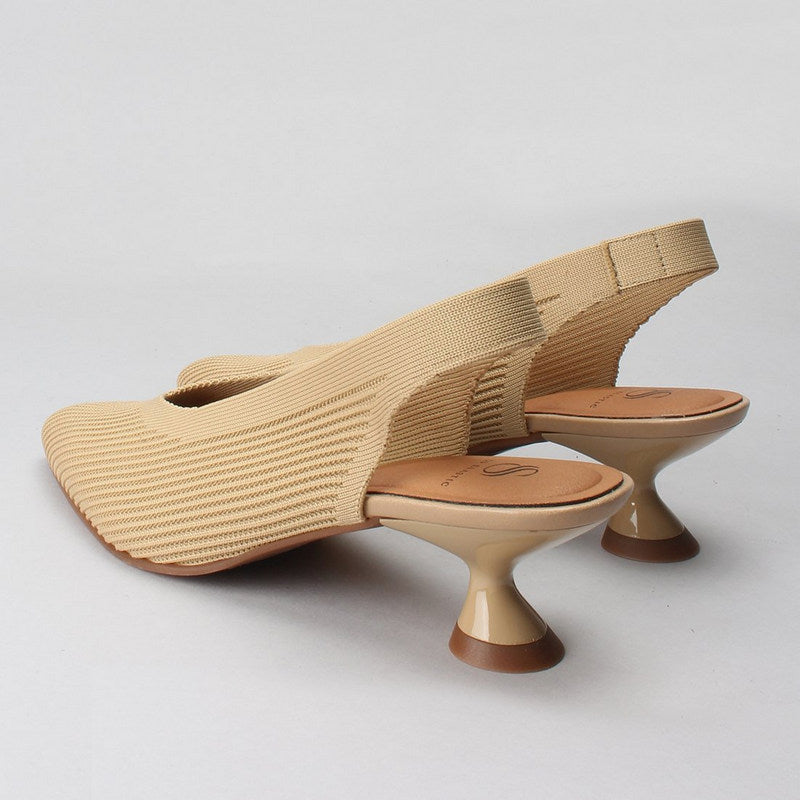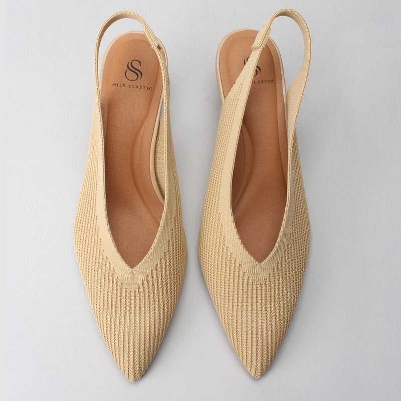 Salón destalonado MISS ELASTIC en tejido reciclado de pet ECO-ELÁSTICO ajustable al pie. Punta afilada con escote en pico, tacón bajo redondo de 5 cm. Plantilla Biogel SANI TEX: transpirable, antibacteriana y resistente al mal olor. Suela de goma.