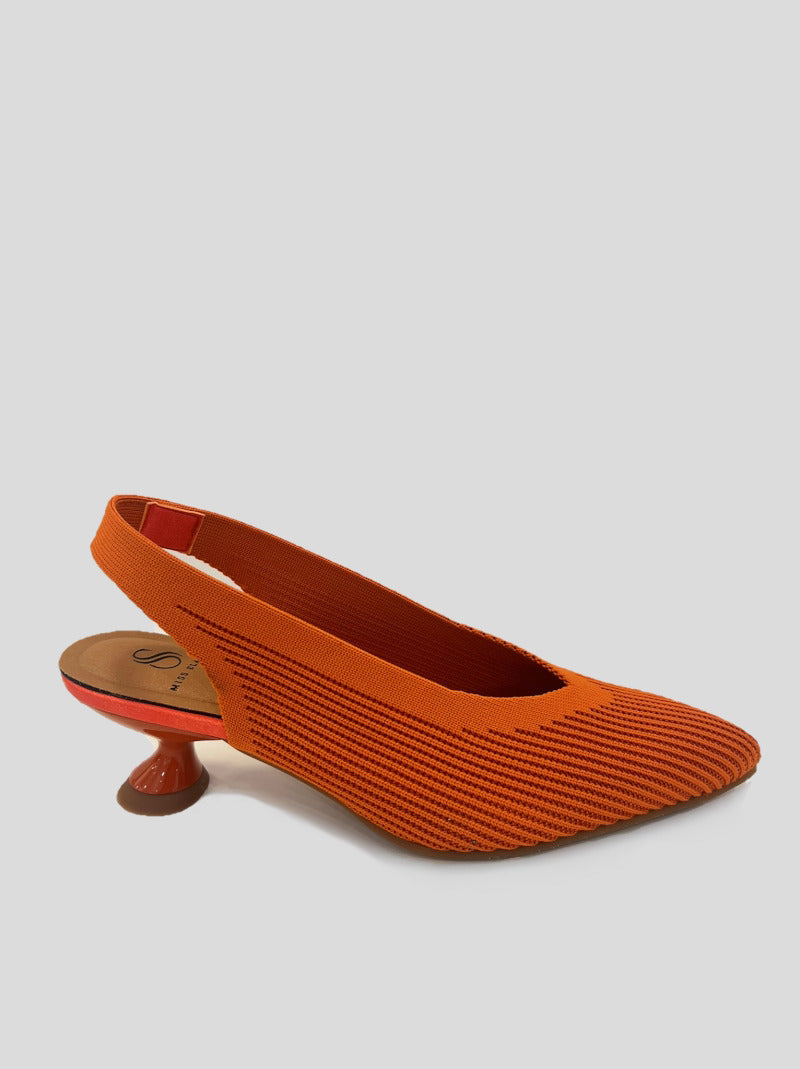 Salón destalonado MISS ELASTIC en tejido reciclado de pet ECO-ELÁSTICO ajustable al pie. Punta afilada con escote en pico, tacón bajo redondo de 5 cm. Plantilla Biogel SANI TEX: transpirable, antibacteriana y resistente al mal olor. Suela de goma.