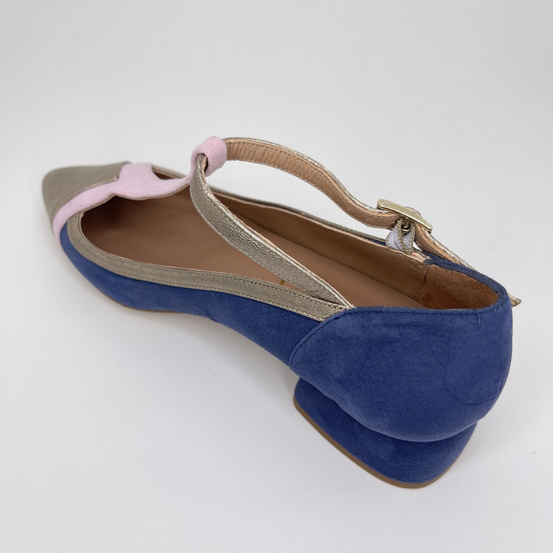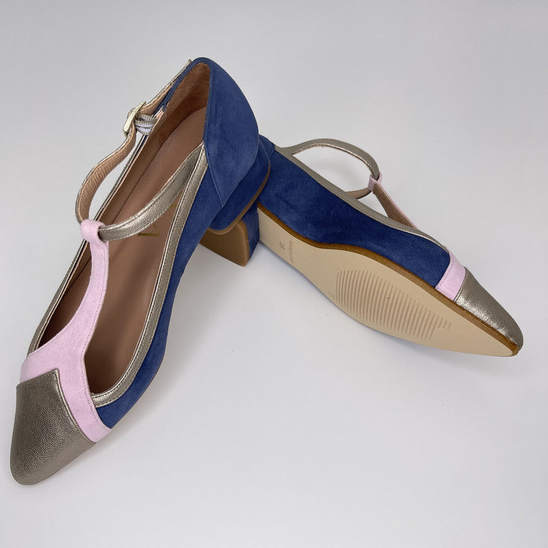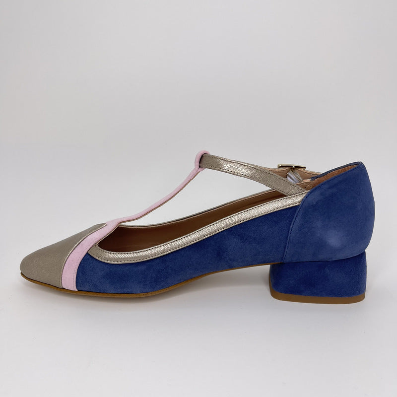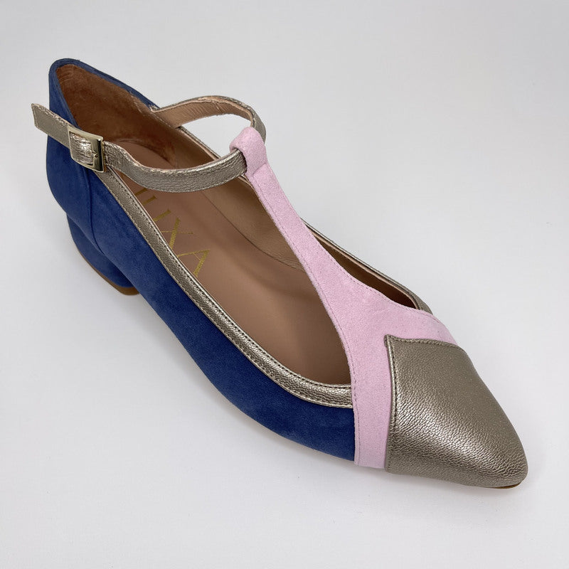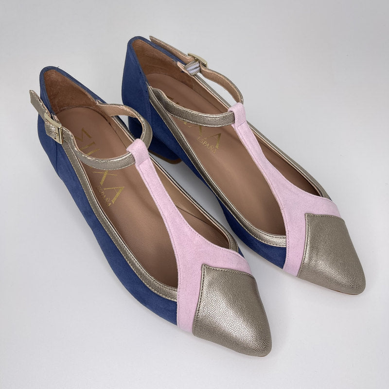 Merceditas de MIUXA que combina cuerpo en ante AZUL BÁLTICO con tira de pala en ante ROSA y puntera, ribete y tira de tobillo en piel laminada ONIX. Tacón redondeado de 3,5 cm forrado en ante al tono. Plantilla de piel acolchada. Suela de cuerolite.