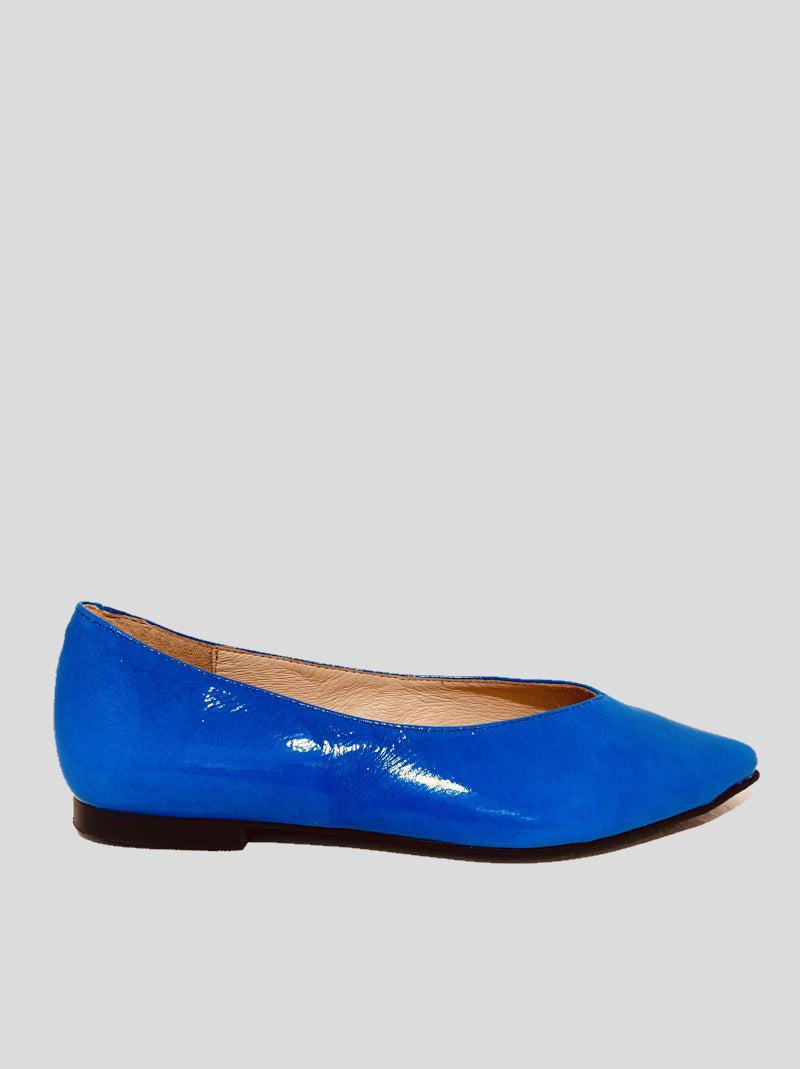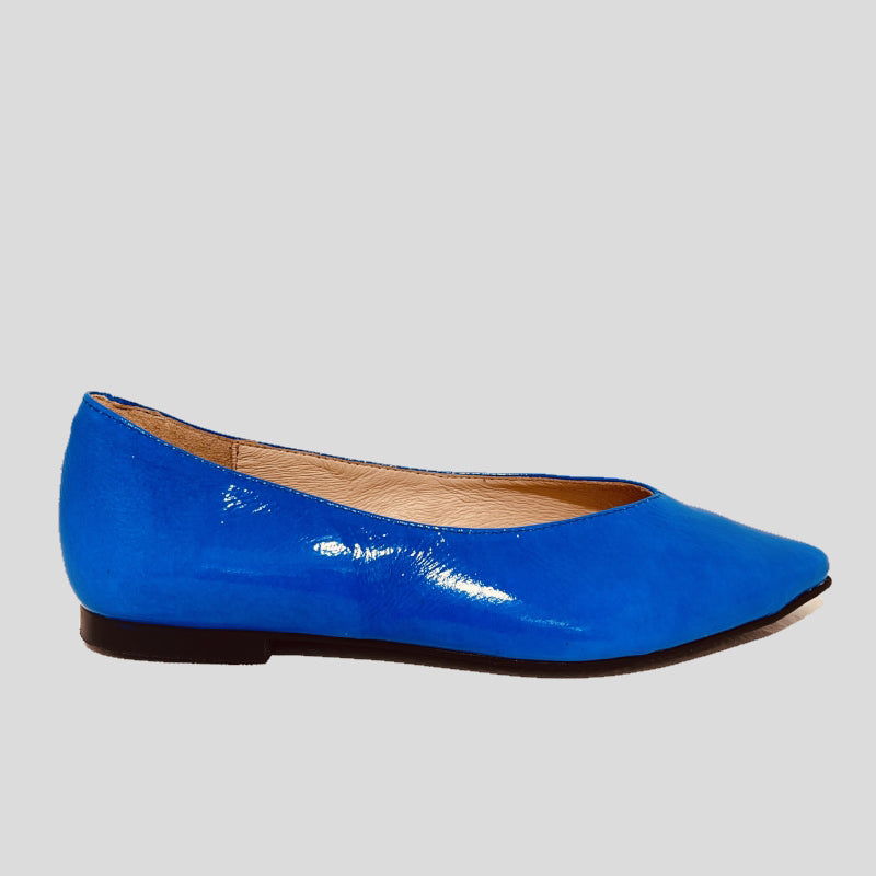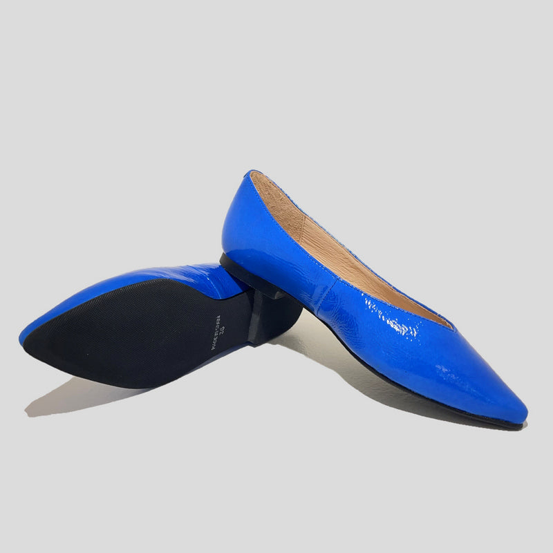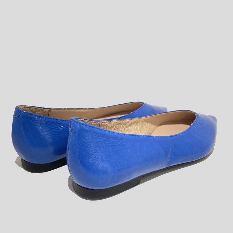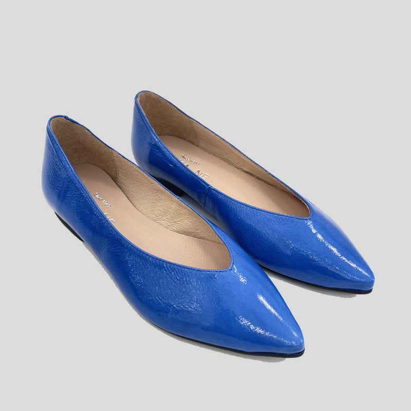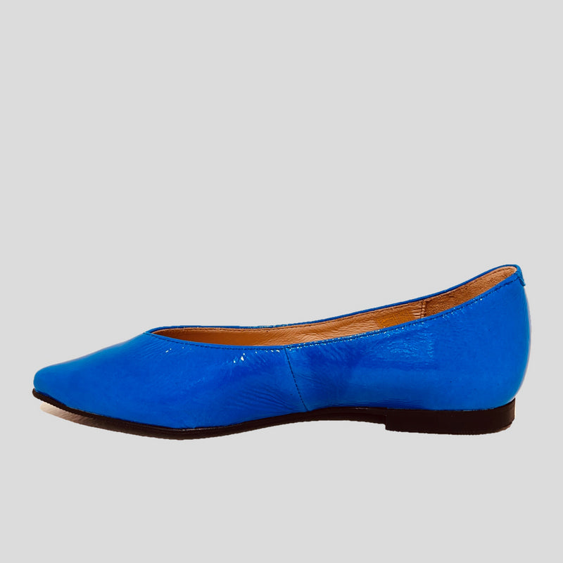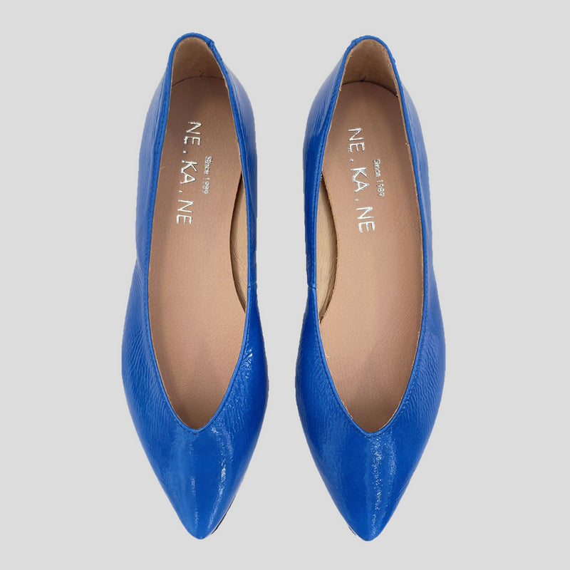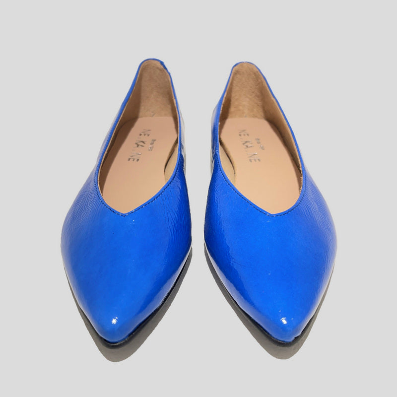 Bailarina plana NE.KA.NE con puntera afilada y escote en V fabricada en piel CHAROL color AZULÓN. Lleva plantilla interior acolchada, forro de piel y suela de goma antideslizante.Tacón plano de 1cm.