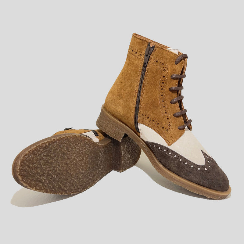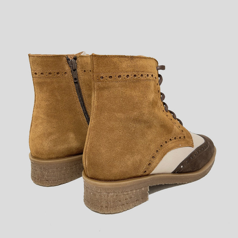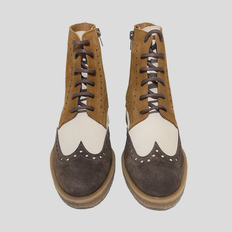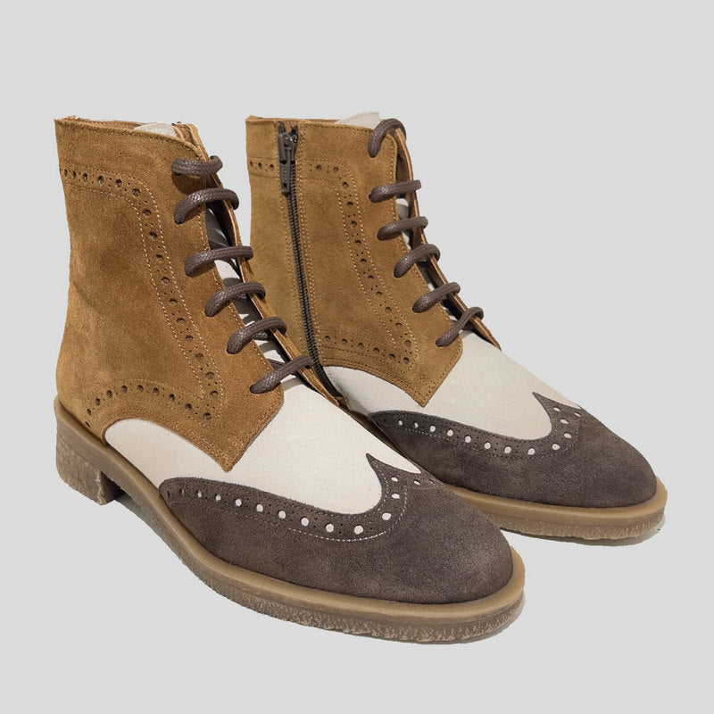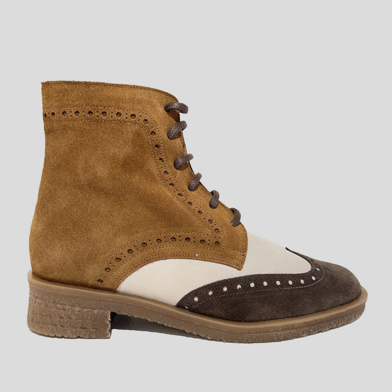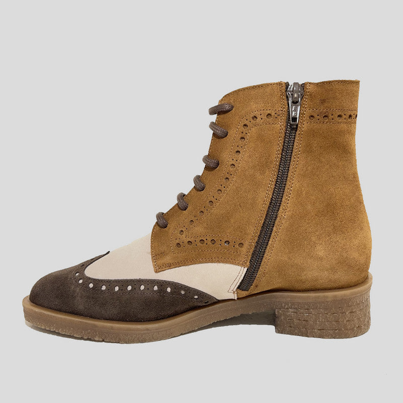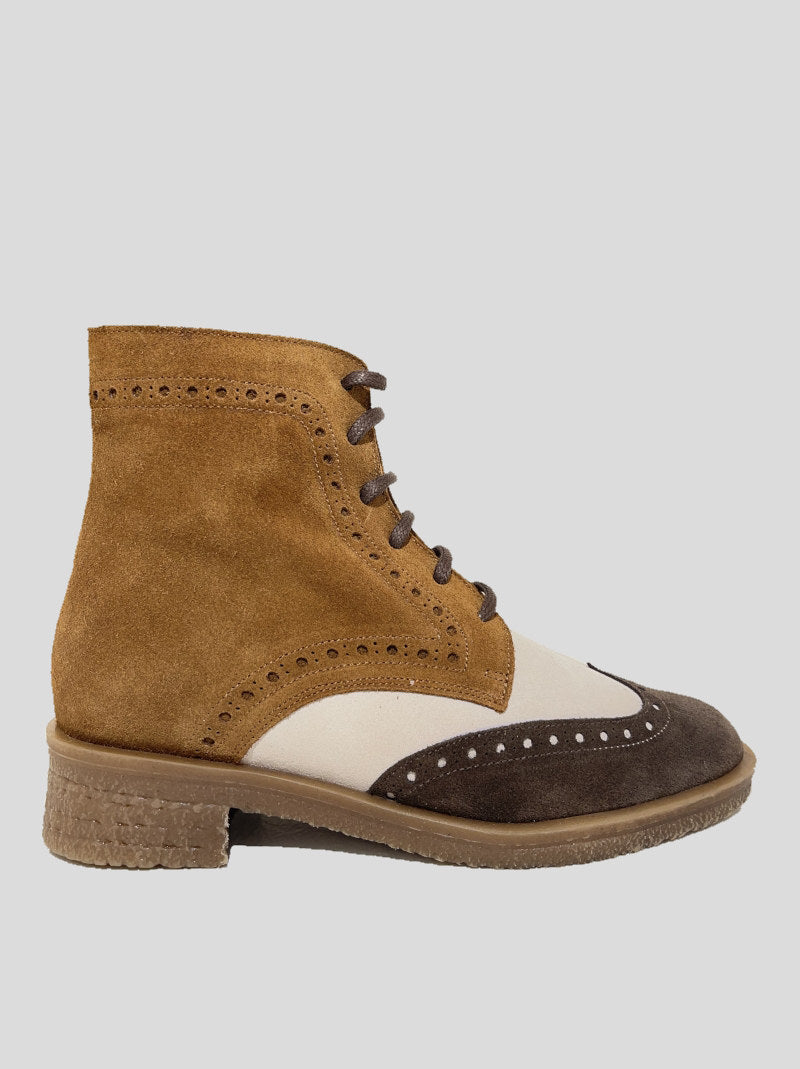 Botín Mujer Oxford de NE.KA.NE estilo inglés picado en ante tricolor que combina MARRÓN, CUERO y BEIGE. Ajuste por cordones y cremallera, forro interior en piel y microfibra, plantilla de piel acolchada. Suela de goma de tocino antideslizante al tono.