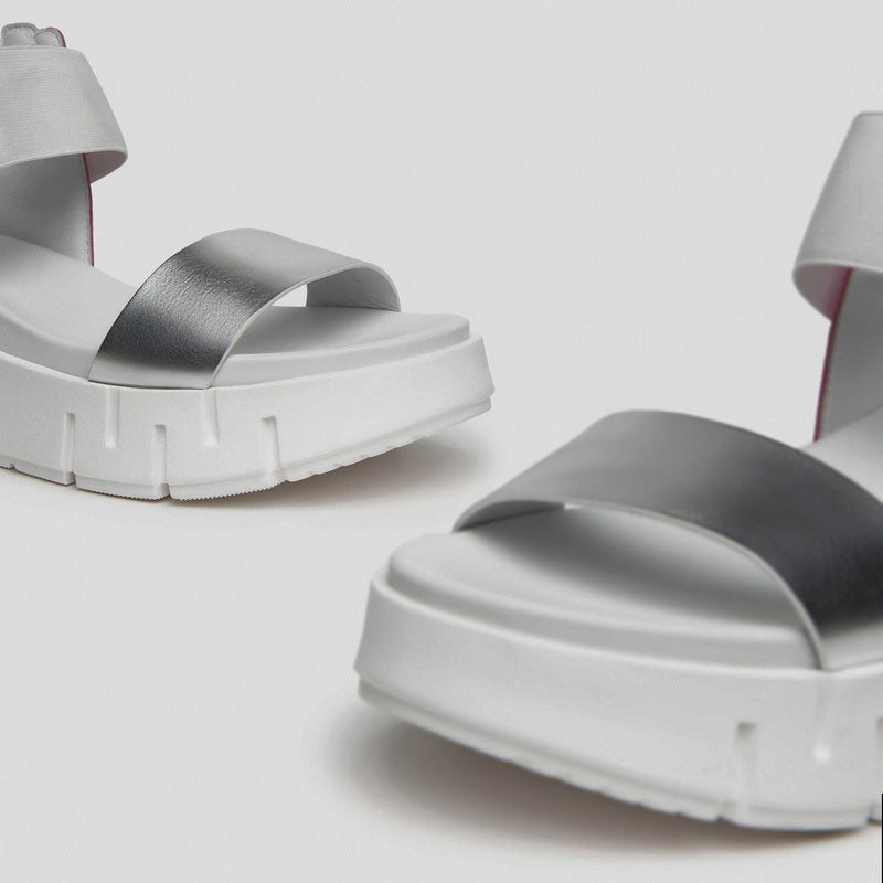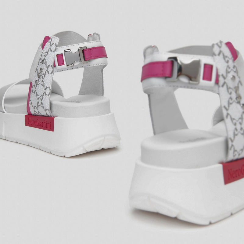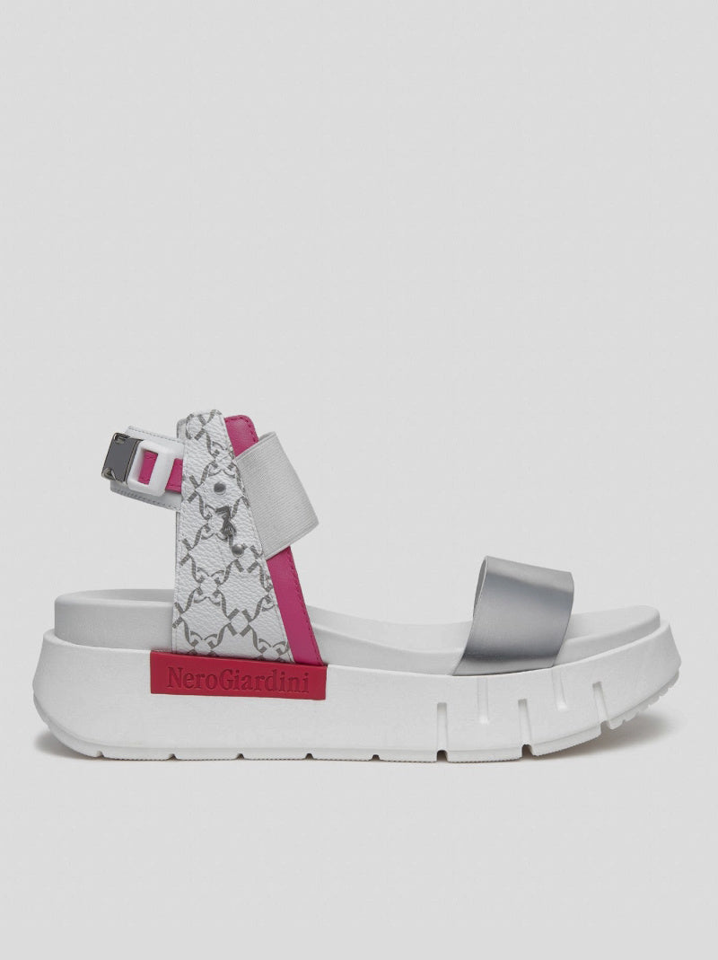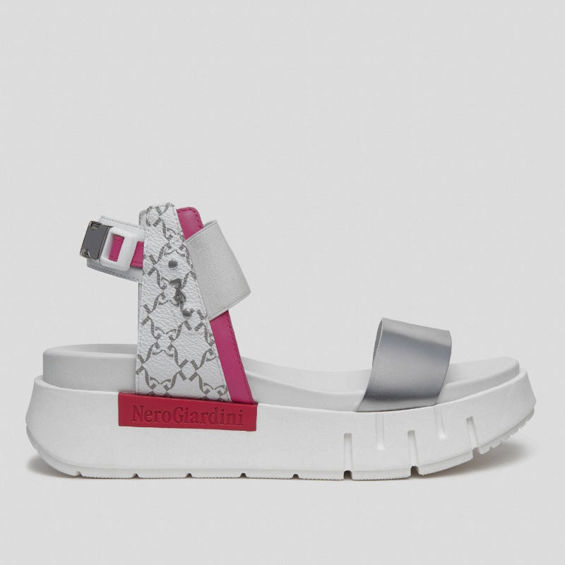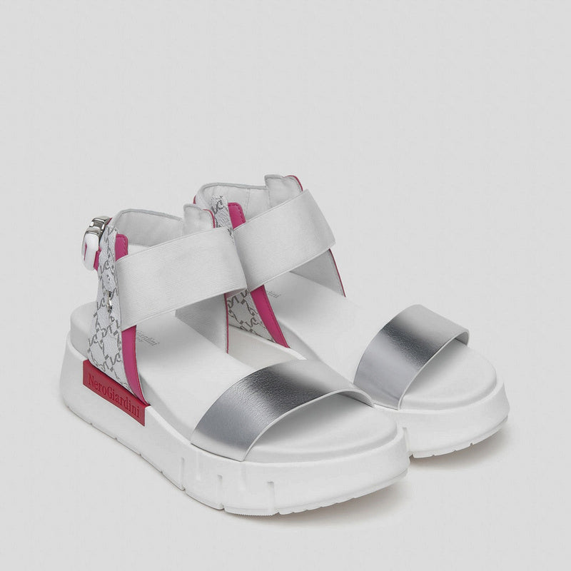 Sandalia de NERO GIARDINI fabricada en combinación de piel espejo PLATA con aplicaciones de piel gragada con LOGOS en contraste. Banda elástica FUCSIA y correa en el tobillo con hebilla decorativa y detalles de piel en blanco. Plataforma de goma de 4 cm.