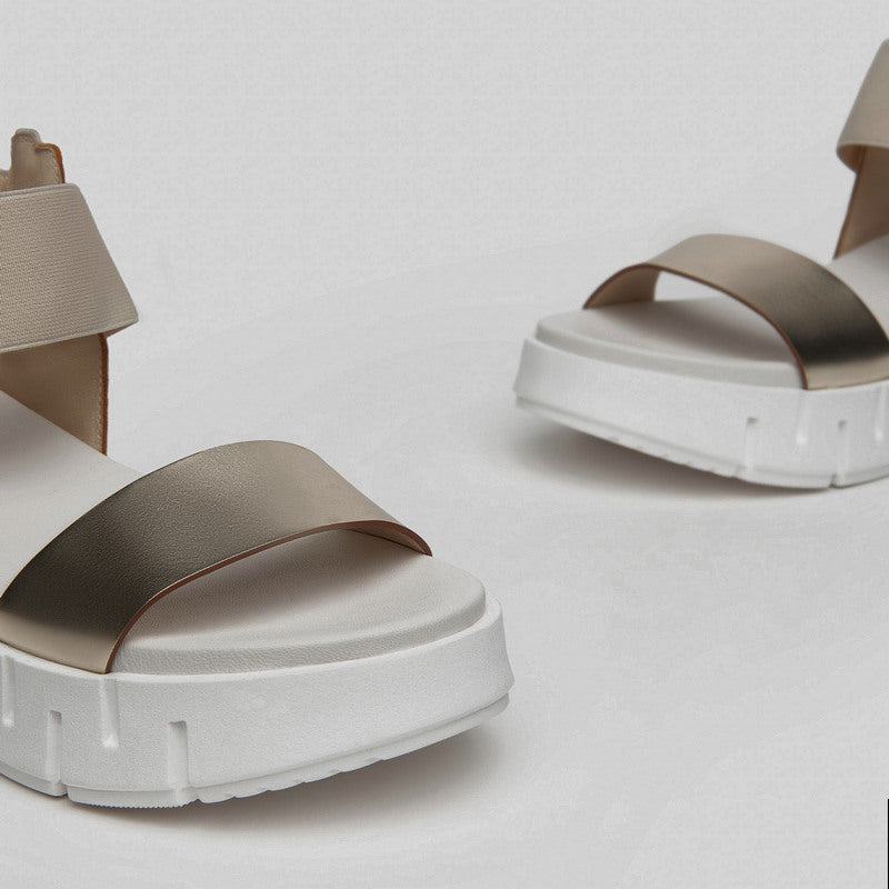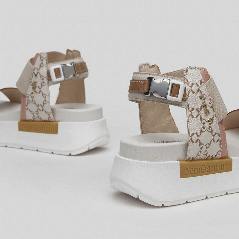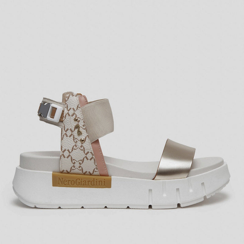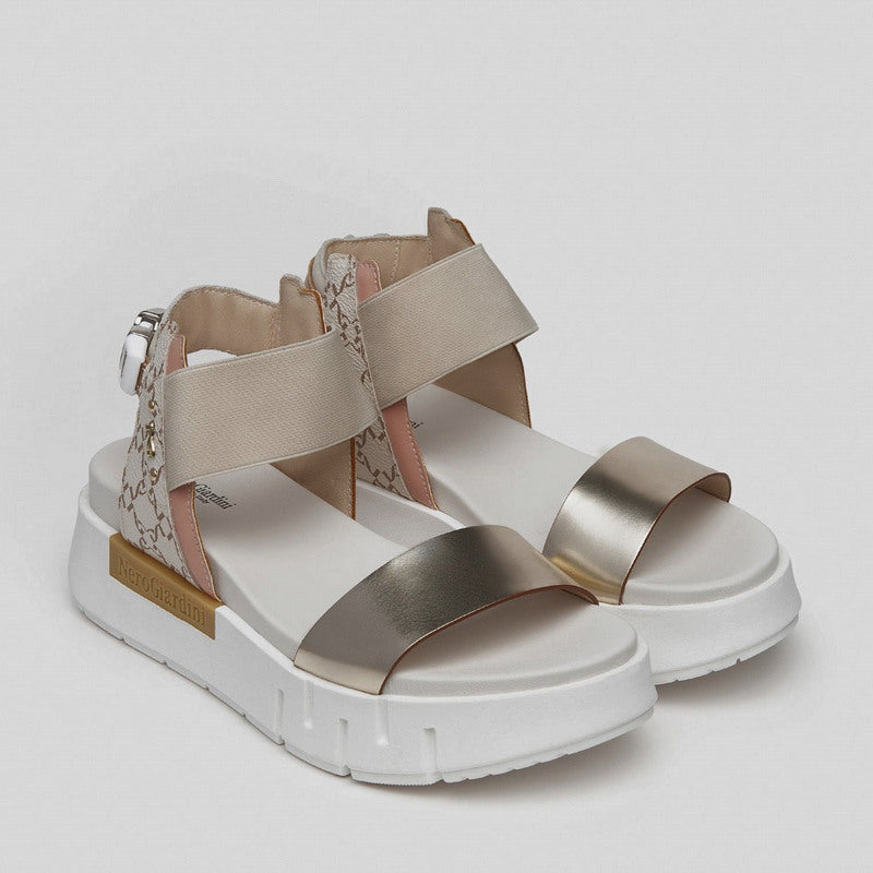 Sandalia de NERO GIARDINI fabricada combinando piel espejo PLATINO con aplicaciones de piel gragada con LOGOS en contraste. Banda elástica BEIGE y correa en el tobillo con hebilla decorativa y detalles de piel en beige y nude. Plataforma de goma de 4 cm.