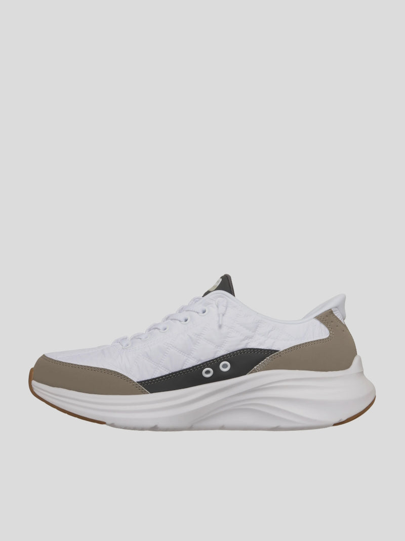 SKECHERS Hombre Hands Free Slip-ins® Contour Foam™ - Cozy Fit™ color BLANCO y TAUPE. Diseñadas con el sistema exclusivo Heel Pillow™. Parte superior acolchada Cozy Fit™ y una capa superpuesta sintética con cordones elásticos. amortiguación Contour Foam™.