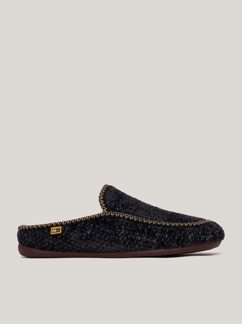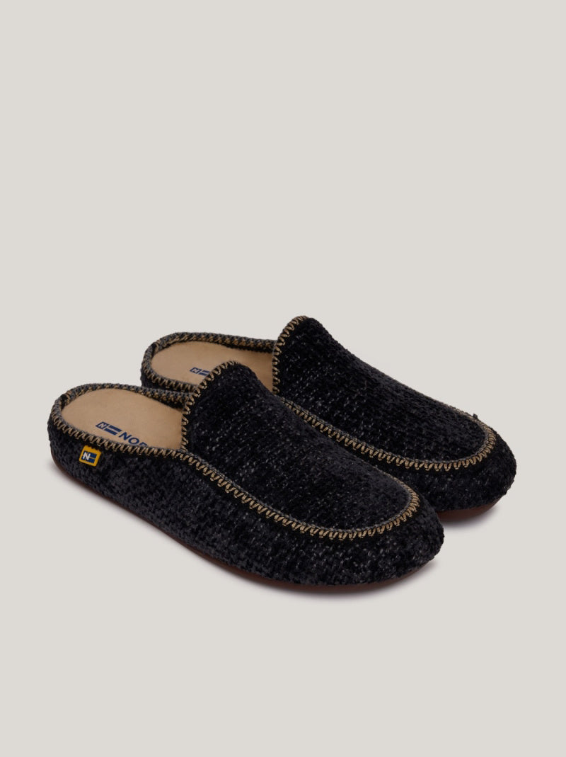 Zapatillas de casa NORDIKAS de HOMBRE modelo 2195 SIOUX ISLANDIA color NEGRO estilo mocasín abierto. Realizada en tejido texturizado chenilla con ribetes en contraste beige. Forro interior aterciopelado super agradable. Suela plana de goma antideslizante.