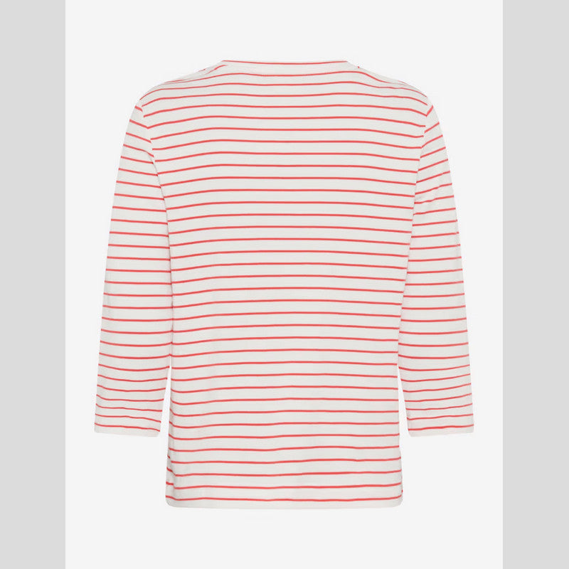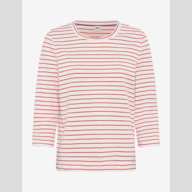 Camiseta de BRAX FEEL GOOD modelo CIRA en algodón orgánico sostenible con estampado de rayas marineras color ROJO con BLANCO. Diseño de silueta recta con escote redondo y manga francesa 3/4. Algodón suave con tacto agradable y excelente transpirabilidad