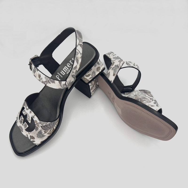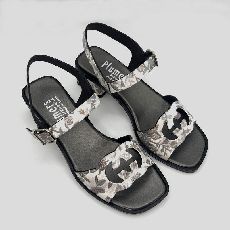 Sandalia con tacón bajo de PLUMERS en piel BLANCA con estampado floral en tonos PLATA y BEIGE. Tira delantera con detalle troquelado y tira trasera en "Y" con ajuste por hebilla. Plantilla de piel acolchada. Tacón cuadrado de 5 cm forrado al tono.