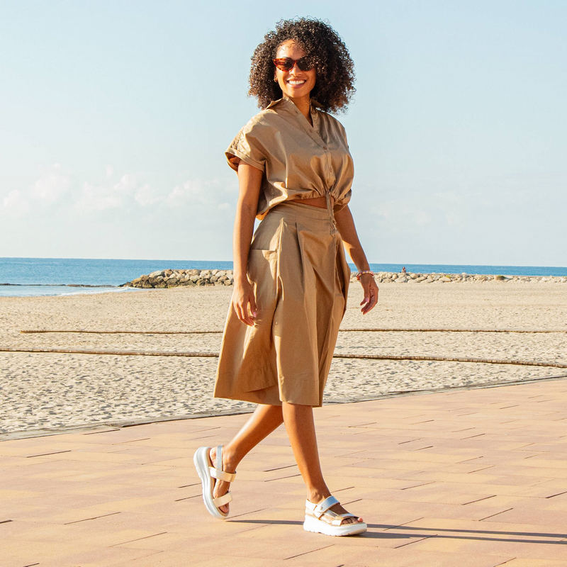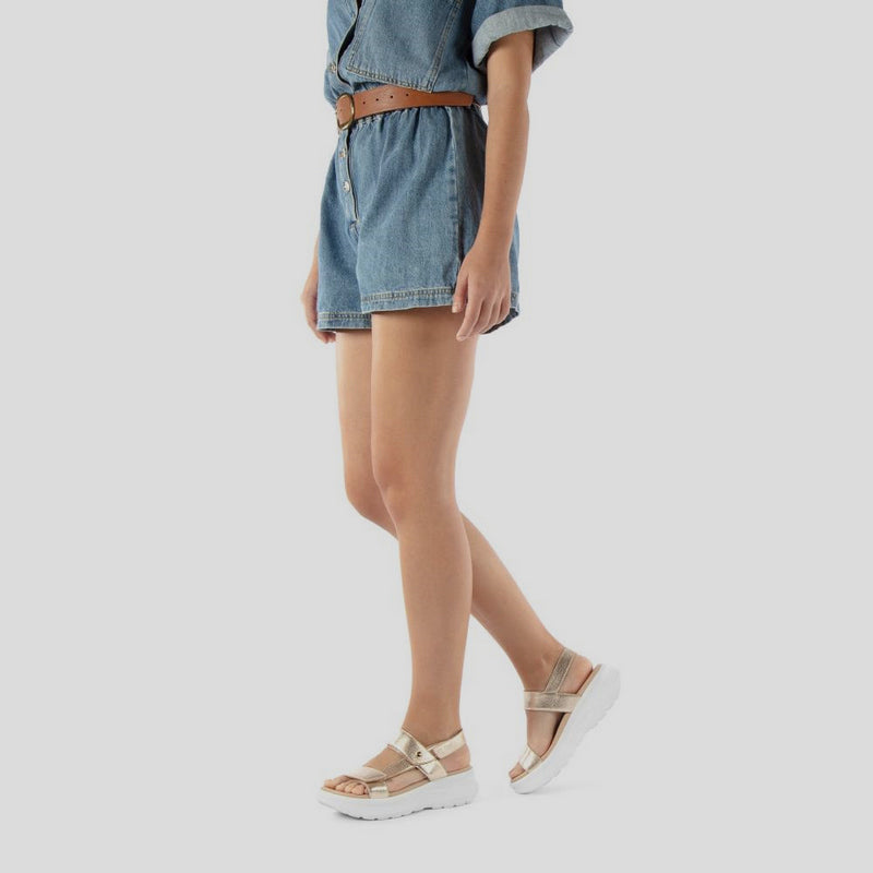 Sandalia de mujer PANAMA JACK con tiras de piel napa METALIZA ORO con forro en piel y TRIPLE ajuste por velcro. Plantilla anatómica de piel muy acolchada para garantizar una gran sensación de confort. Suela con plataforma de PU flexible y resistente.