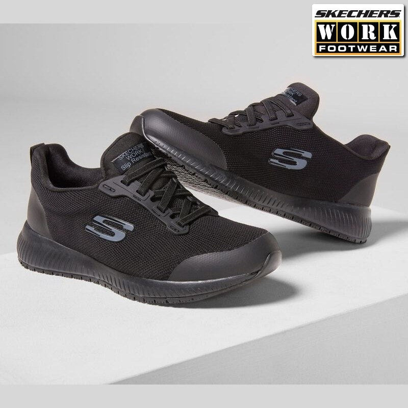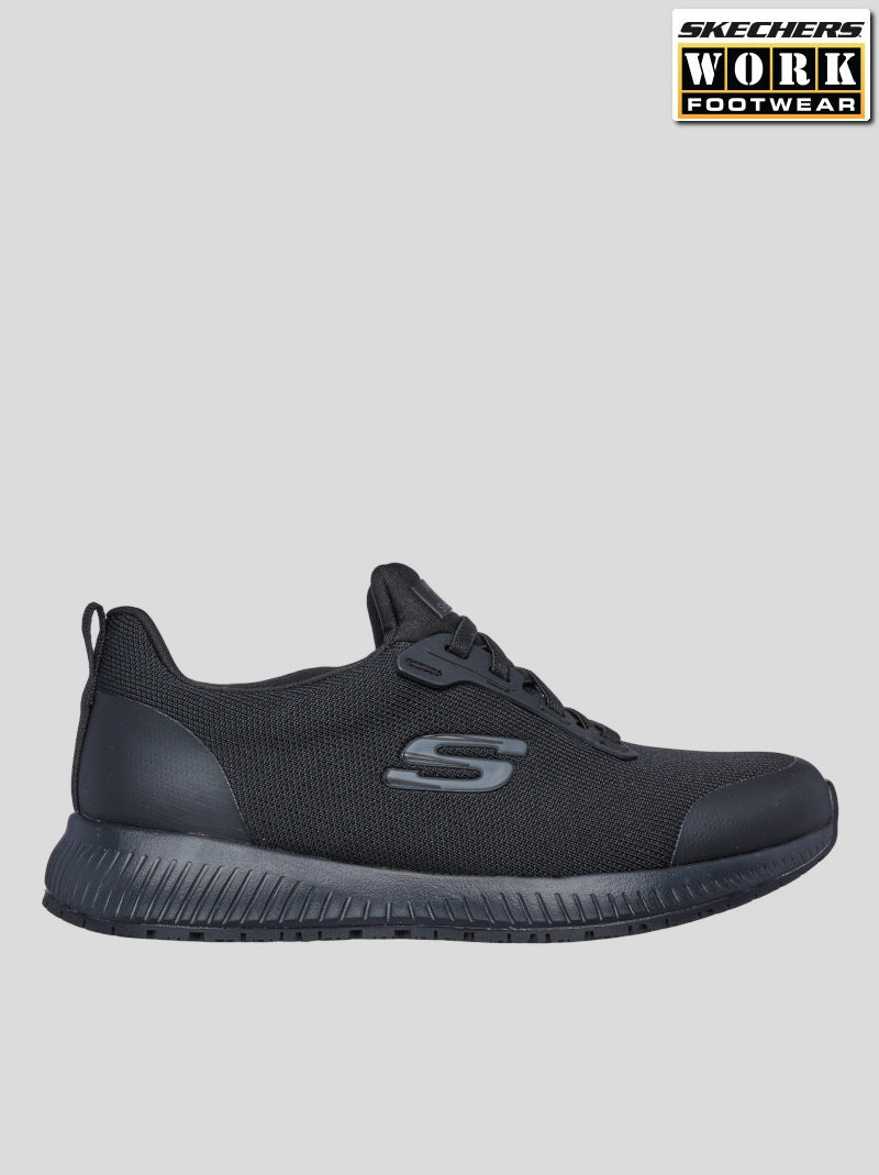 Deportiva mujer con elásticos de SKECHERS de la línea de trabajo WORK SQUAD SR color NEGRO. Parte superior de tejido sintético y malla con tratamiento REPEL WELL para proteger de líquidos, aceites y manchas. Suela antideslizante PERFECTA PARA EL TRABAJO.