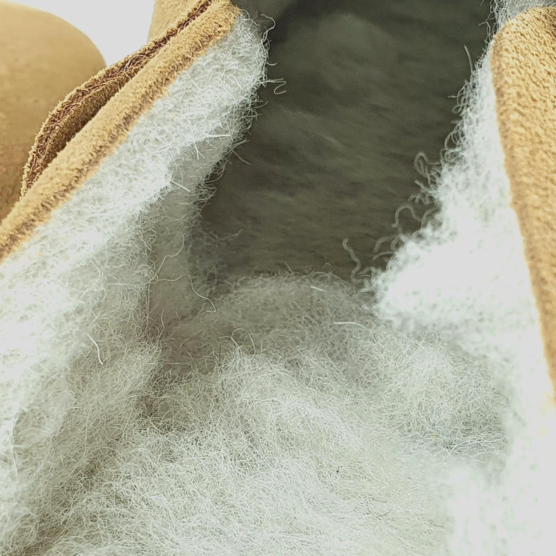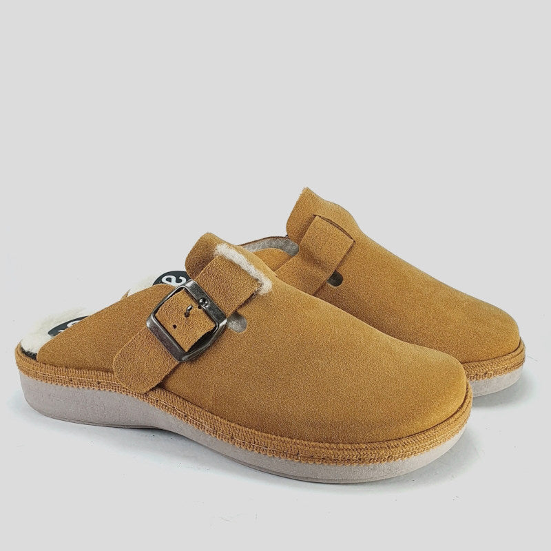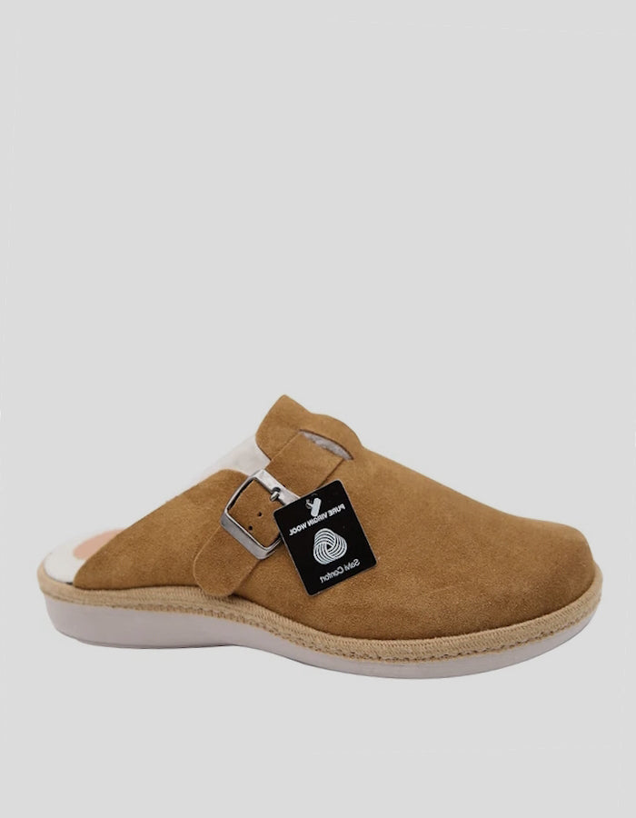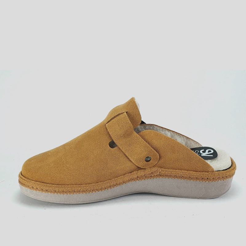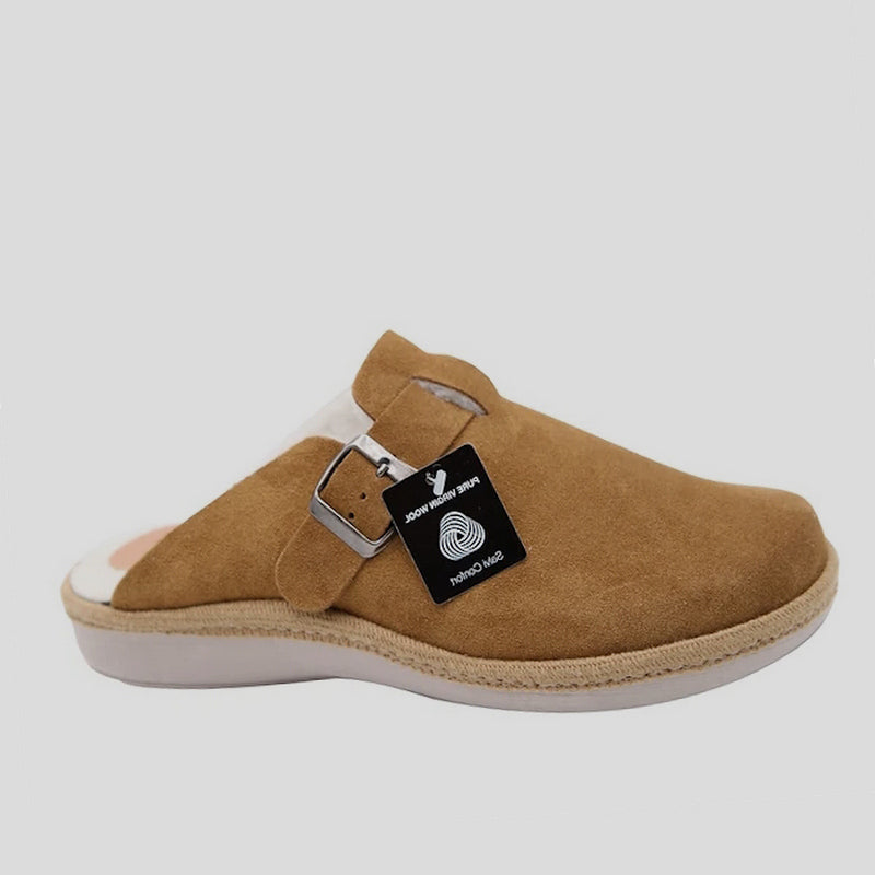 Zapatilla Abierta de casa confeccionada exteriormente en SERRAJE color CUERO y forrada interiormente en PURA LANA VIRGEN color BEIGE. Modelo estilo zueco con ajuste por TIRA CON HEBILLA. Plantilla interior acolchada en lana. Suela de goma en cuña flexible