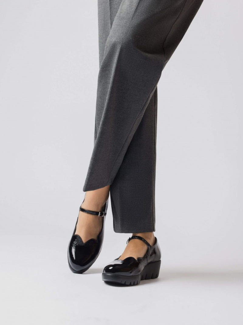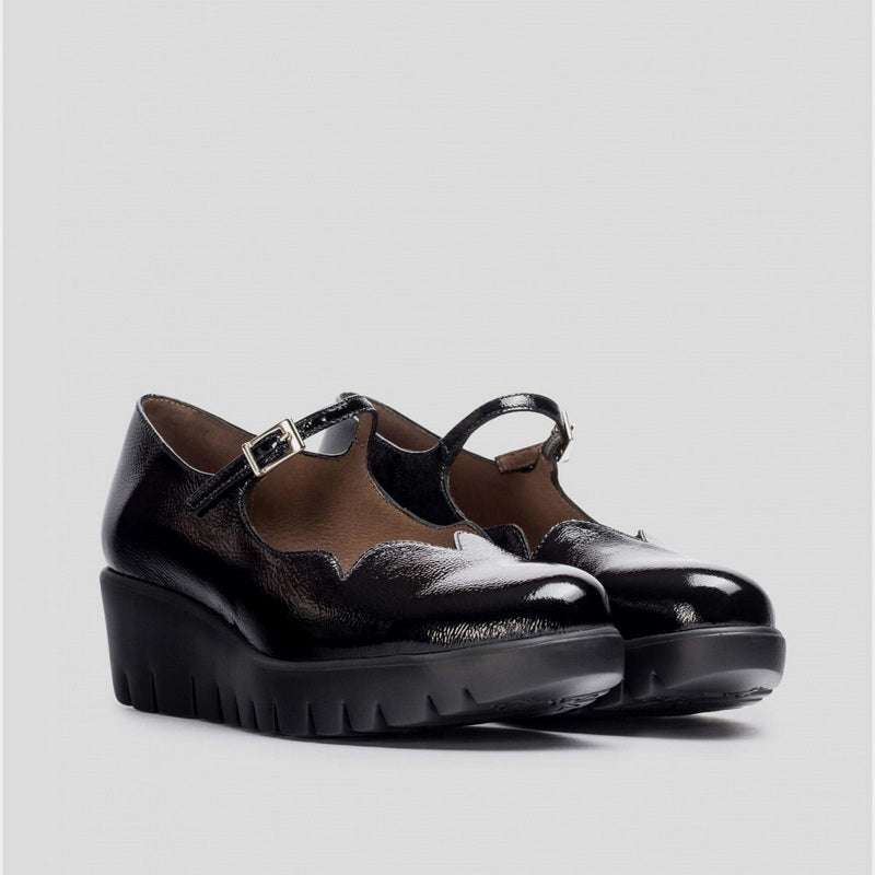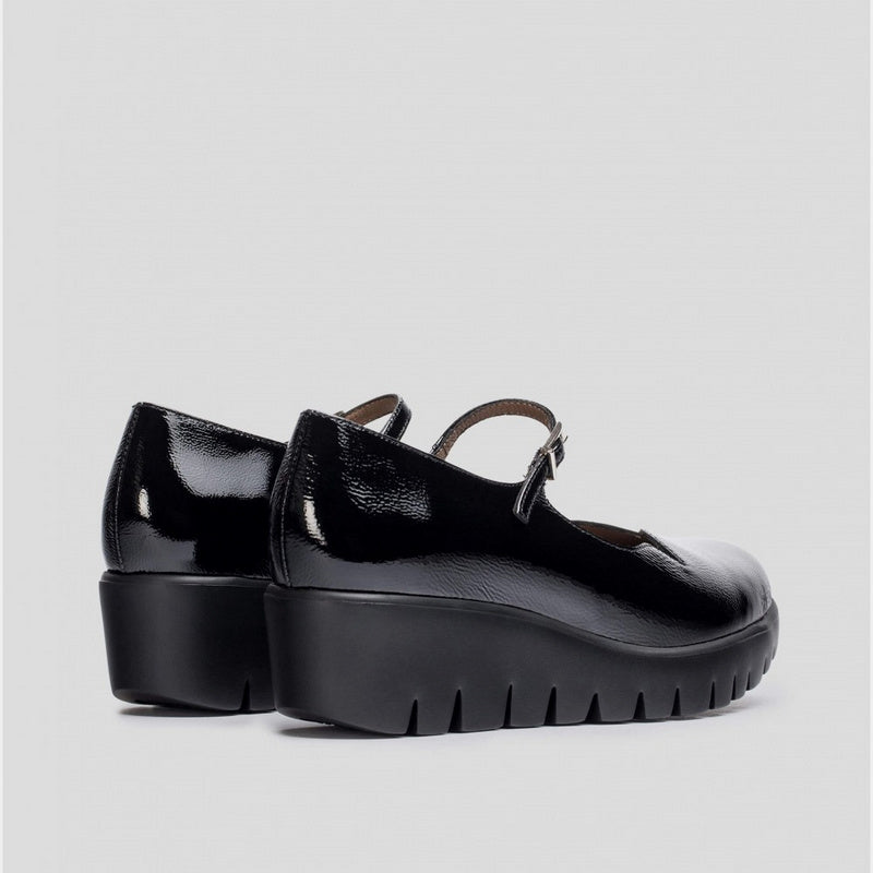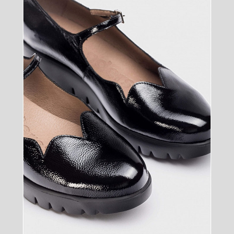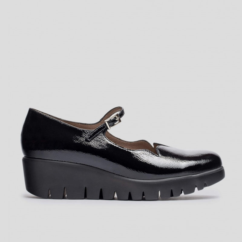 Merceditas SEVILLA con cuña de WONDERS en piel charol NEGRO con ajuste por hebilla y detalle de ondas en el corte delantero. Suela maxi desarrollada con tecnología WondersFly ™ garantía de ligereza y confort . Prepárate para la sensación, YES WE FLY.