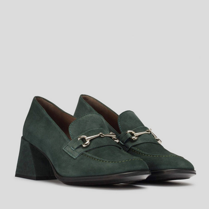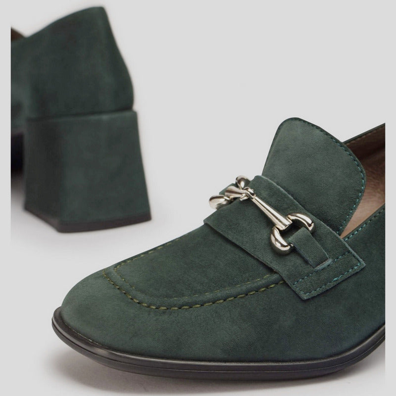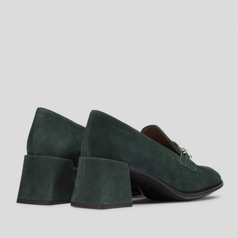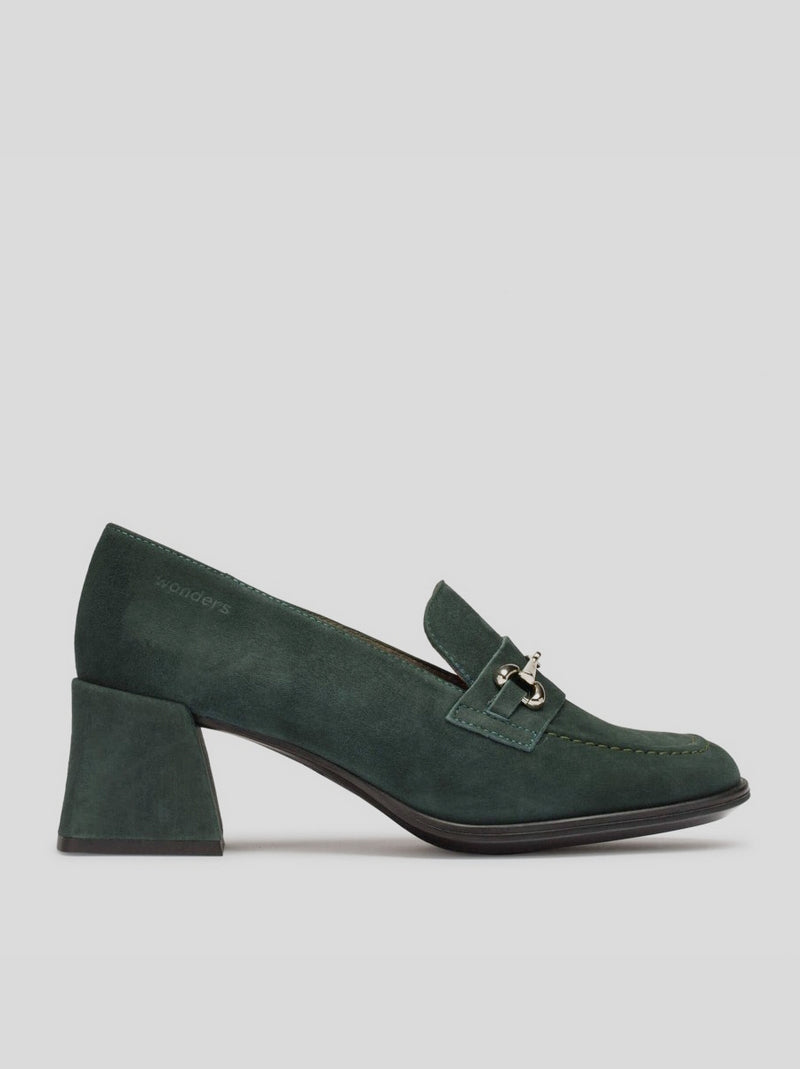 Mocasín CELIA de WONDERS en ante VERDE BOTELLA. Modelo clásico con detalle de trabilla metalizada en el antifaz, punta y tacón cuadrado forrado en ante al tono. Plantilla MemoryGel amortiguada y que se adapta a la pisada. Suela de tpu flexible.