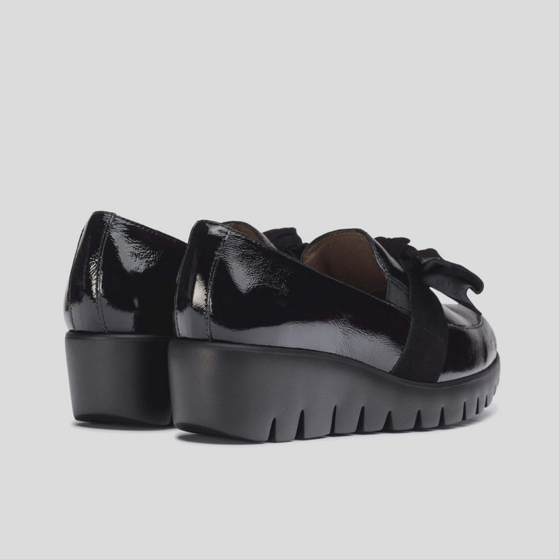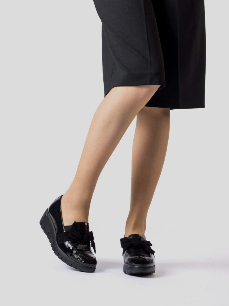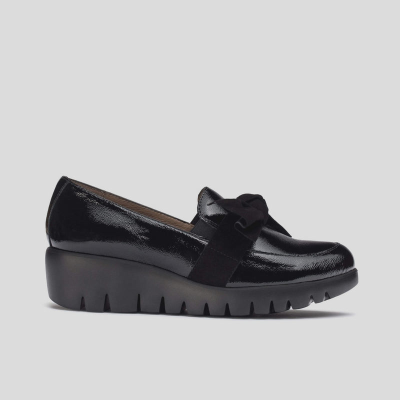 Mocasín ROMEO con cuña de WONDERS en piel charol arrugado NEGRO. Lazo de ante al tono en el empeine con elástico interior. Suela maxi desarrollada con tecnología WondersFly ™ garantía de ligereza y confort. Prepárate para la sensación,YES WE FLY.