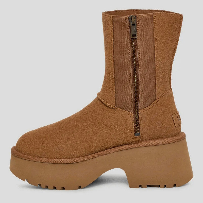 Botas de mujer UGG modelo Classic New Height confeccionadas en ante color CAMEL con costura doble. Forro de UGGplush reciclado y suela de EVA ligera con PLATAFORMA y tacón de 7,6cm. Caña alta y cierre por cremallera lateral interior con refuerzo elástico.