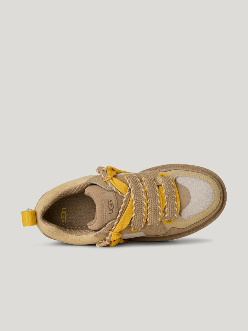 Deportiva de mujer UGG "edición limitada" LO LOWMEL BIARRITZ color MOSTAZA: exterior de ANTE TEXTURIZADO CON PELO con costuras decorativas, lengüeta acolchada, cordones planos bicolor y borla de piel trasera. Forro de malla de poliéster y suela de EVA.