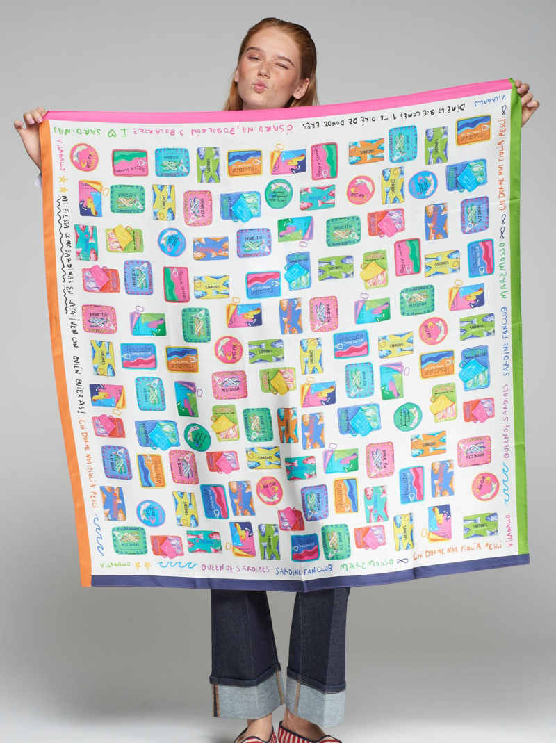 Pañuelo foulard de seda cuadrado grande de VILAGALLO con divertido estampado MULTICOLOR de latas de sardinas y bordes con eslogan original. Diseño exclusivo Vilagallo. DIMENSIONES: 110cm x 110cm