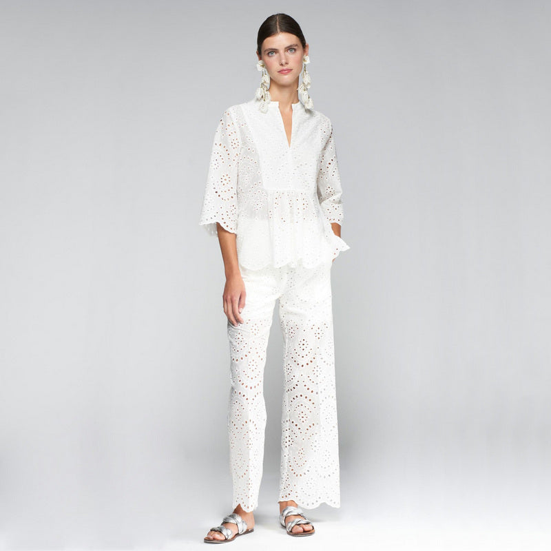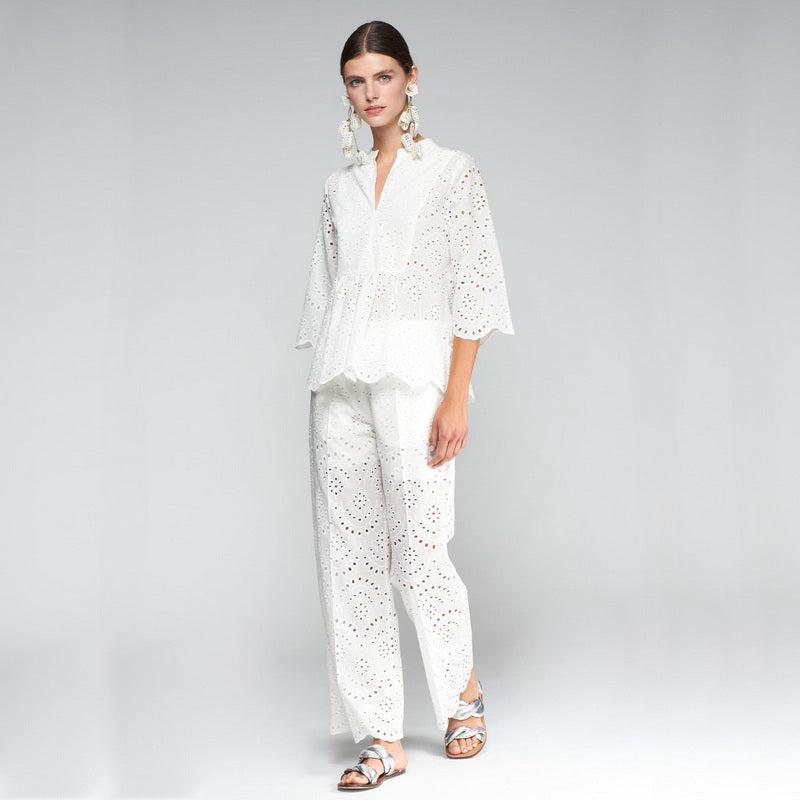 Pantalón de VILAGALLO en algodón BLANCO con bordados y calados sangallo. Lleva cinturilla elástica. Tiene un forro blanco estilo culotte. Bajo acabado en ondas. Lleva bolsillos delanteros franceses y traseros tipo plastrón. Disponible camisa a conjunto.
