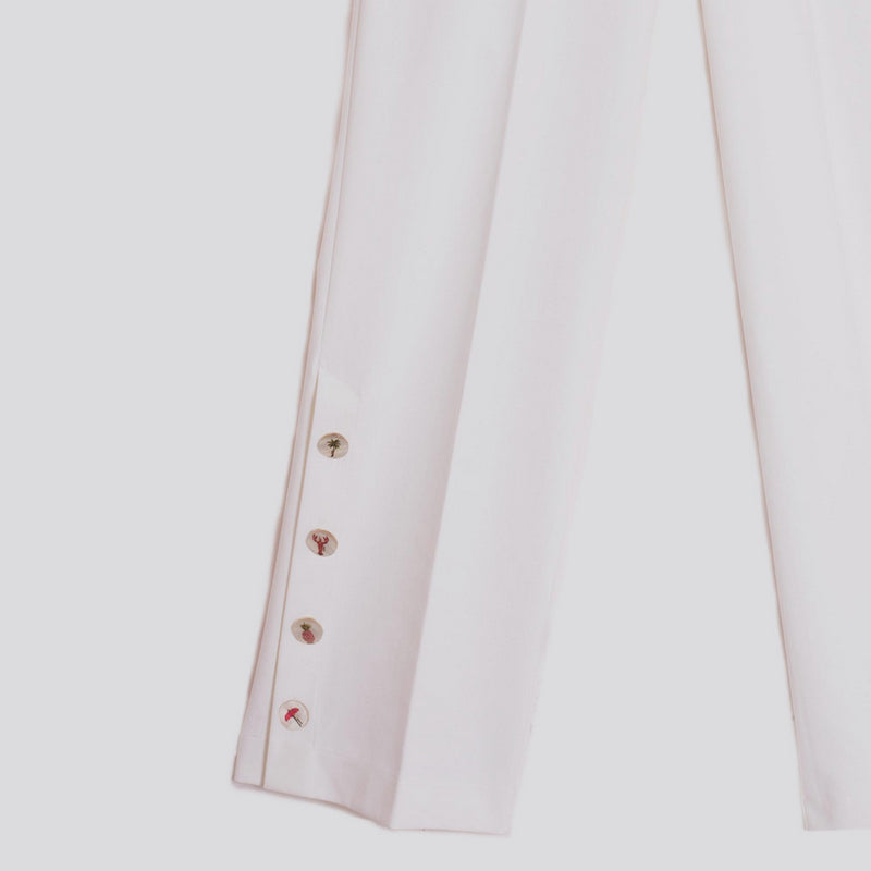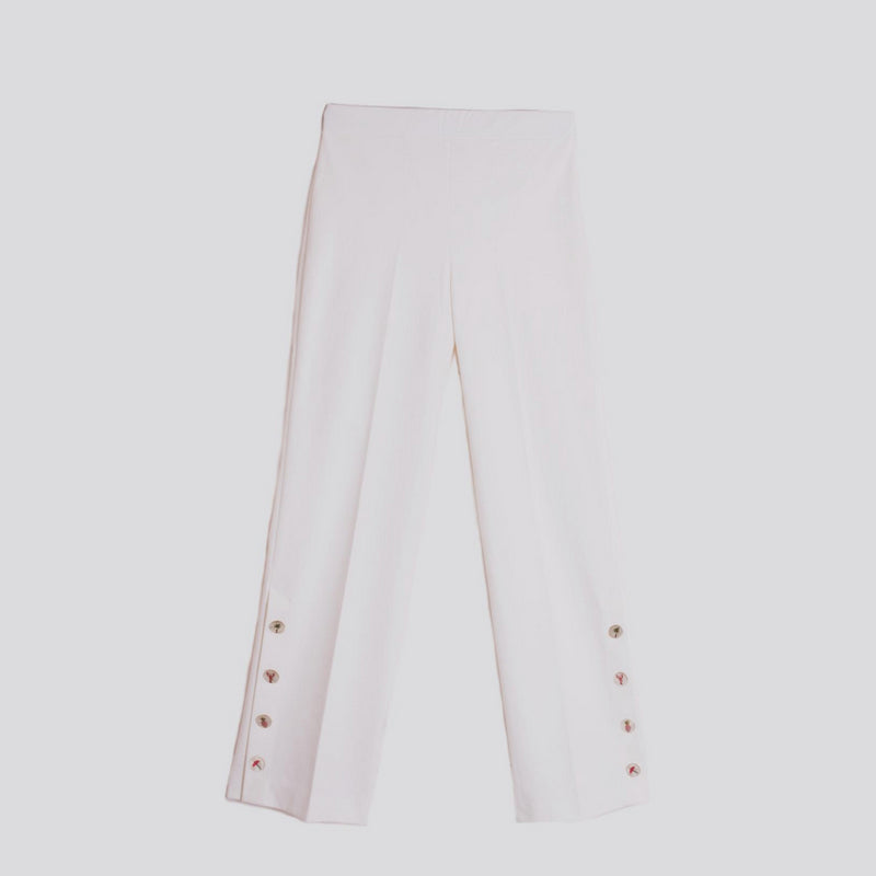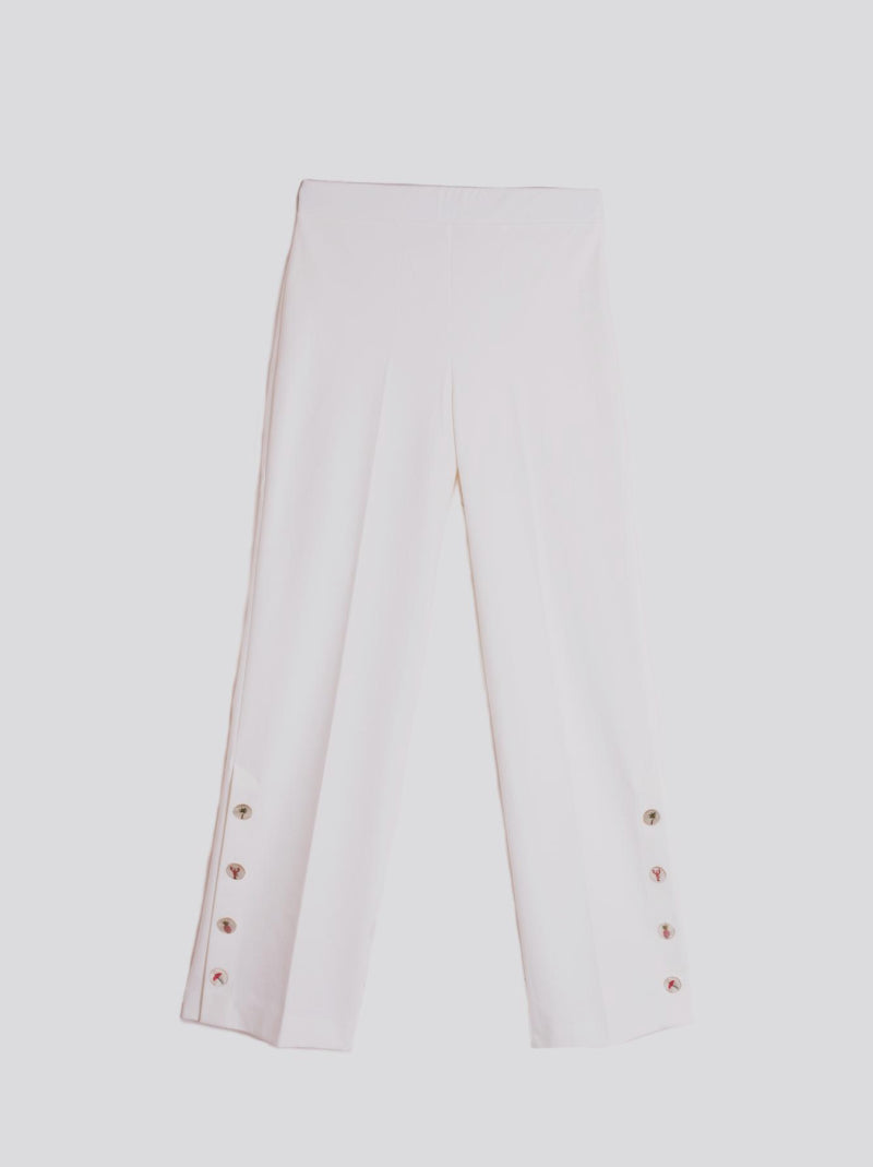 Pantalón de VILAGALLO en punto roma de algodón elástico color BLANCO. Corte recto con detalle de aberturas cerradas con botones decorativos con diferentes dibujos en el bajo. Tejido y cinturilla elásticos.