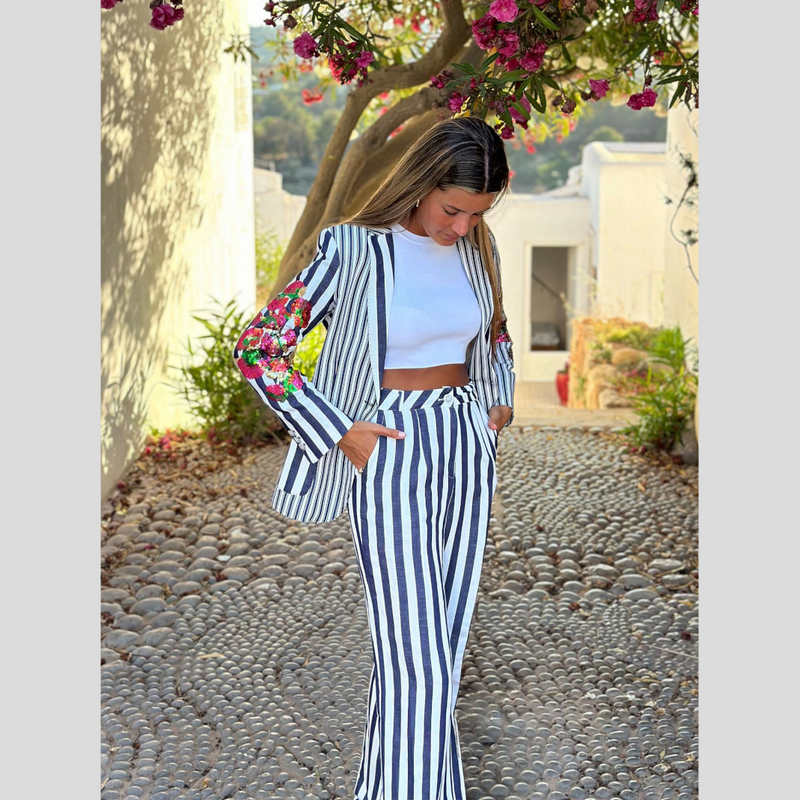 Pantalón de VILAGALLO en mezcla de lino y algodón con estampado de rayas anchas MARINO y BLANCO. Corte palazzo con pierna ancha, cintura con trabillas y cierre por botón y cremallera. Bolsillos delanteros franceses y bolsillo trasero con tapeta de botón.