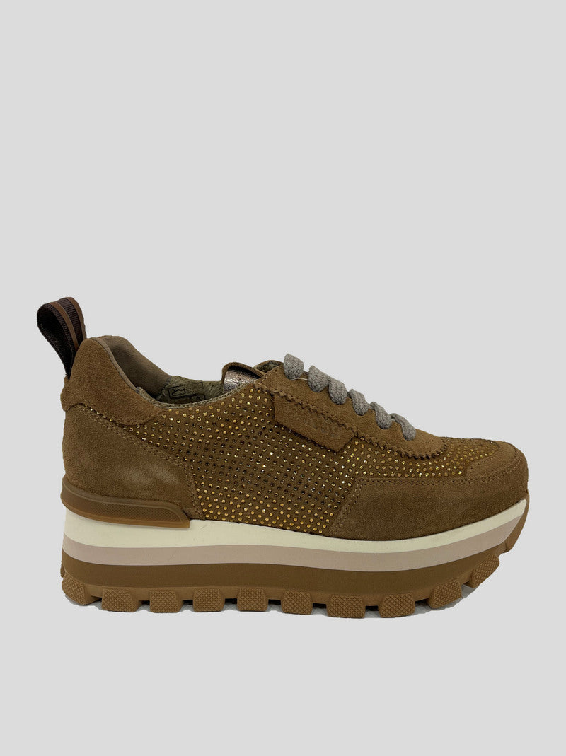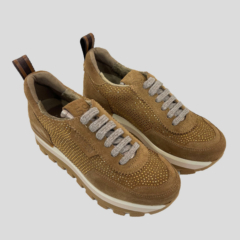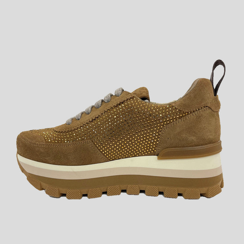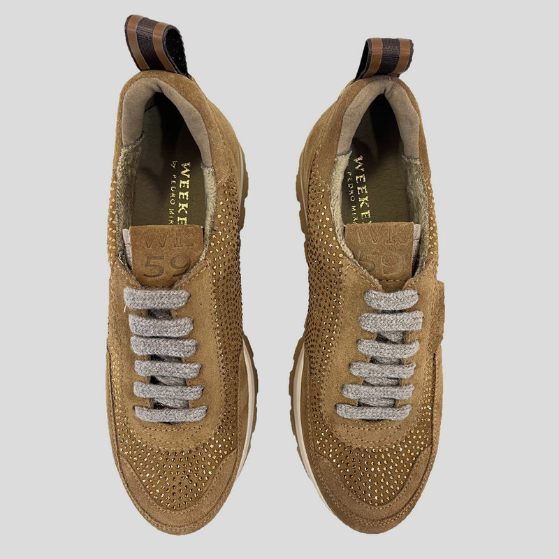 Deportiva con plataforma de WEEKEND en ante color MARRÓN TABACO toda ella decorada con pequeños strass dorados. Plantilla acolchada extraíble de piel. Forro interior en antelina y piel. Plataforma tricolor con suela track antideslizante de caucho.