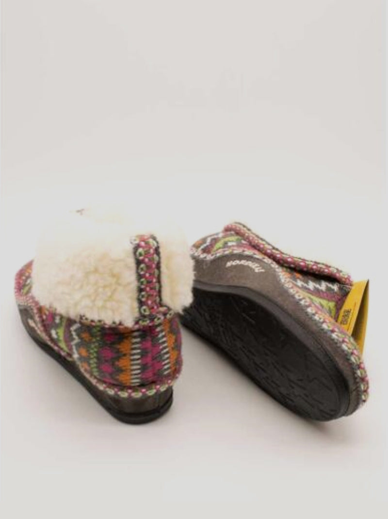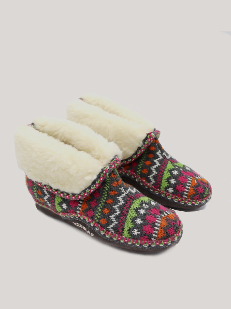 Zapatillas de casa NORDIKAS de mujer modelo 3600 PANTICOSA color GRIS con grecas. Zapatilla abotinada de lana con forro de borreguito con una solapa que se puede subir para abrigar el tobillo. Piso combinado de serraje con goma, ligero y antideslizante.