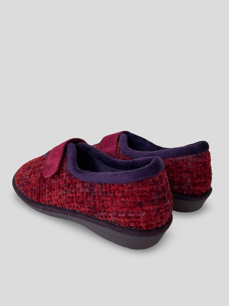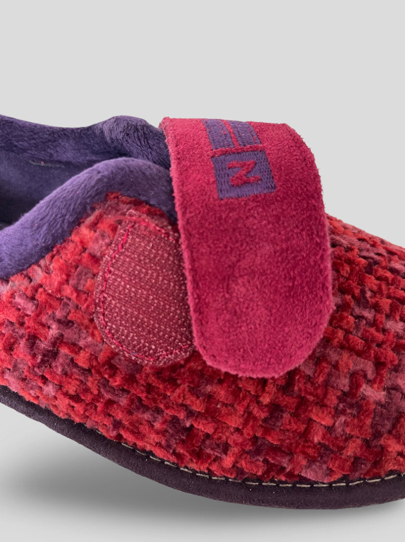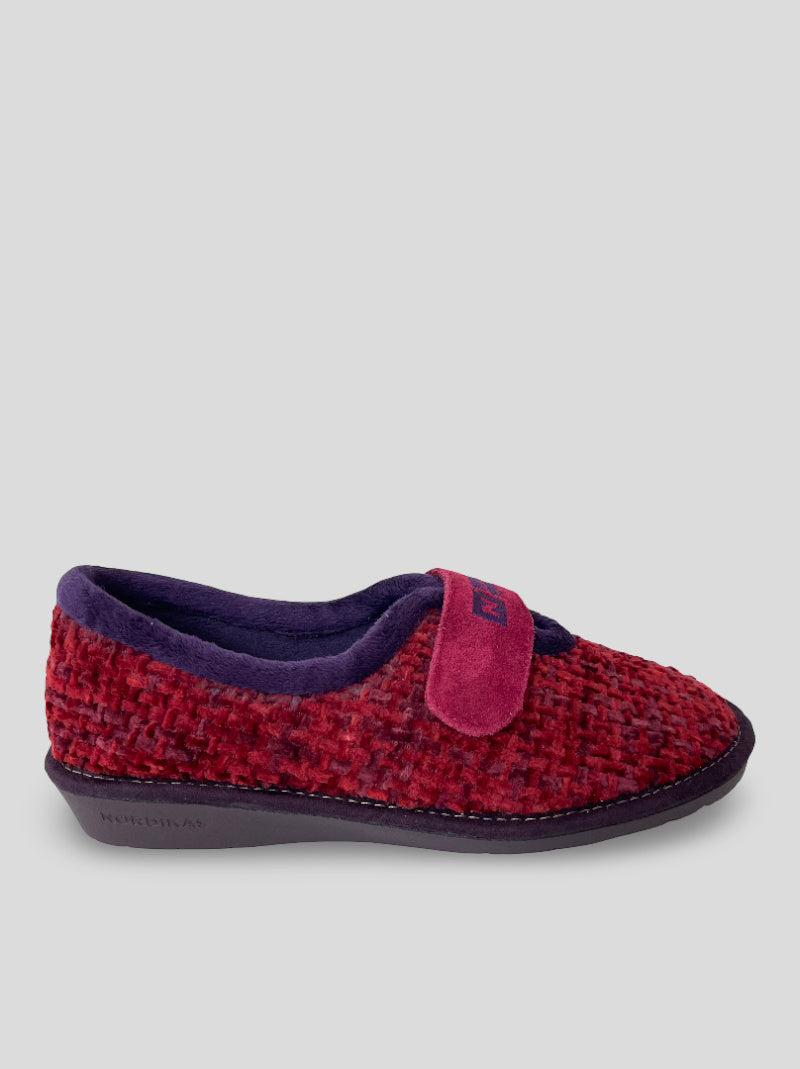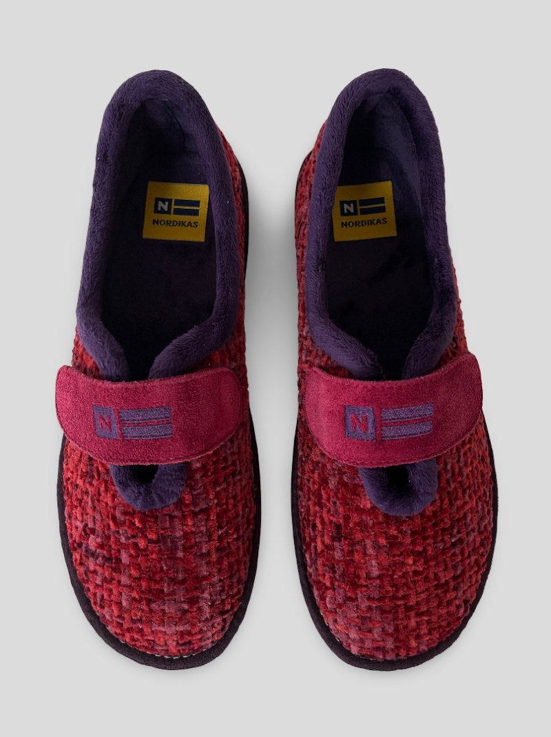 Zapatillas de casa NORDIKAS de mujer modelo TOP LINE 7396/4 QUEBEC color RUBÍ. Ajuste por velcro, cerradas por detrás. Tejido trenzado efecto jaspeado y aterciopelado para una mayor calidez. Suela de goma antideslizante y aislante del frío. Cuña 3cm.