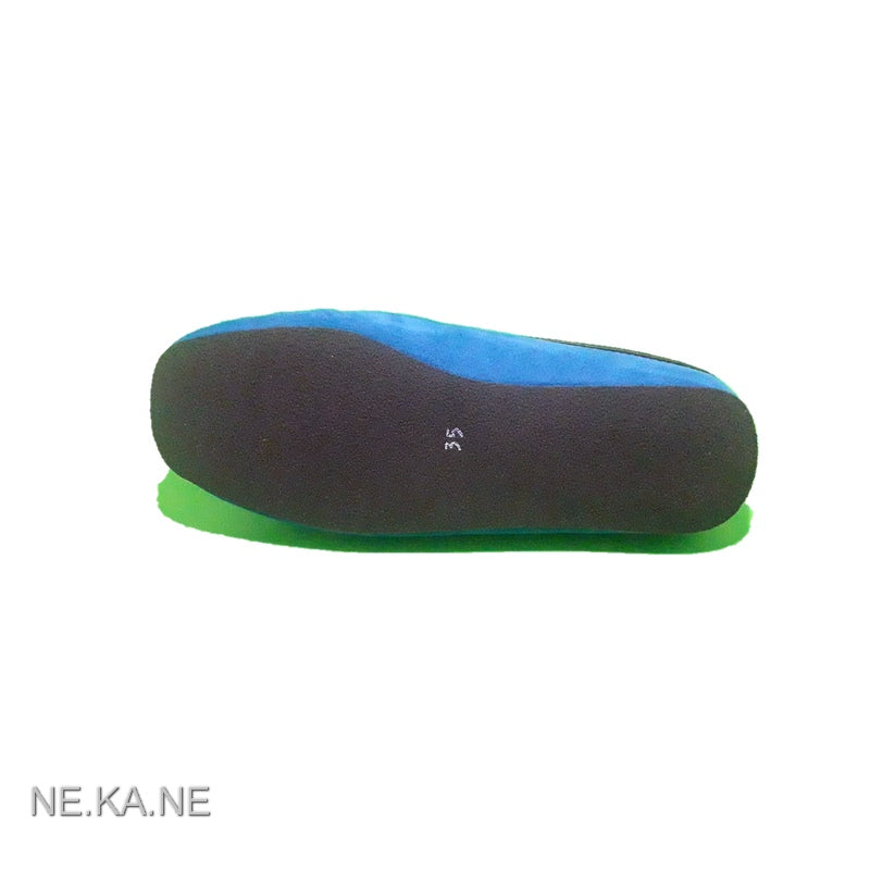 Zapatilla de mujer GADEA MEROÑO modelo 30001 estilo MOCASÍN de piel serraje AZULÓN abierta de talón. Detalle de ribete en piel y costura en zig-zag. Suela fina de goma antideslizante. Cuña baja. Forro interior en antelina con talón acolchado en serraje.