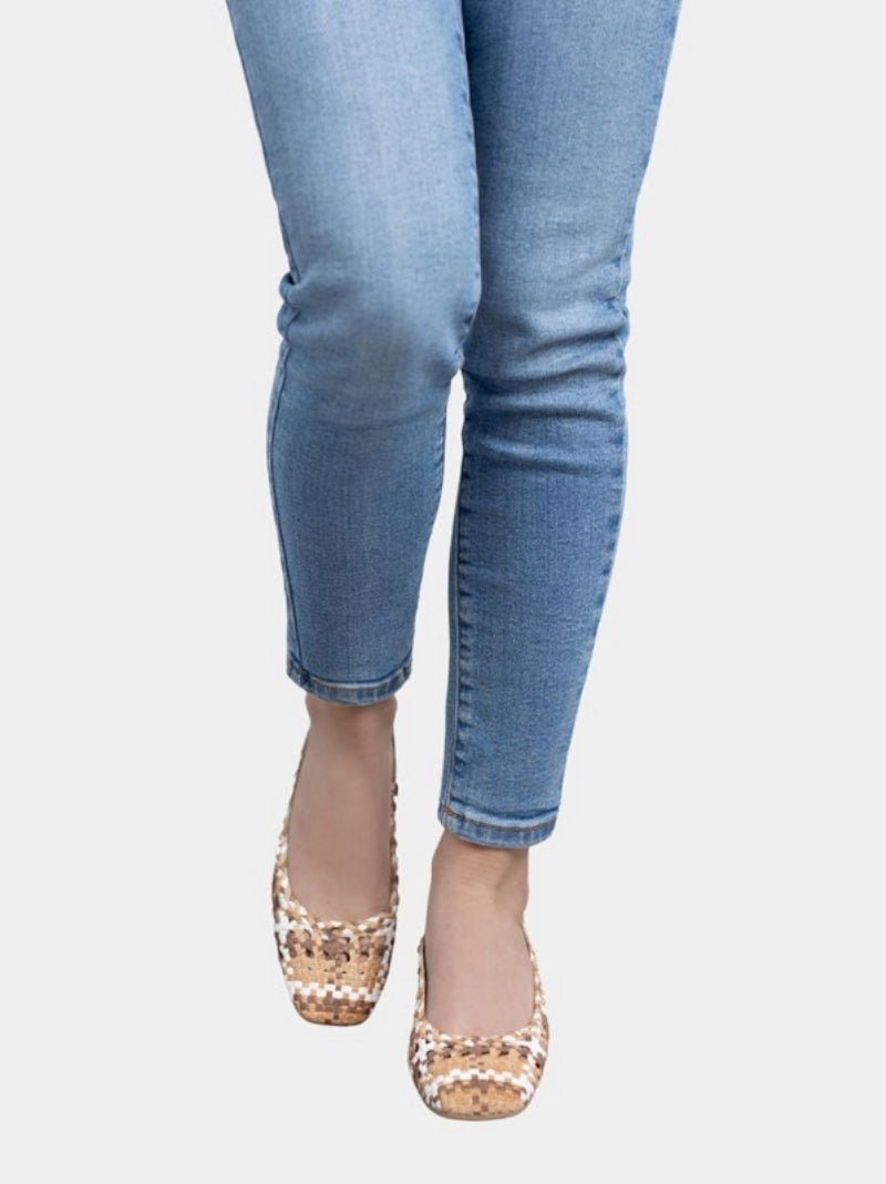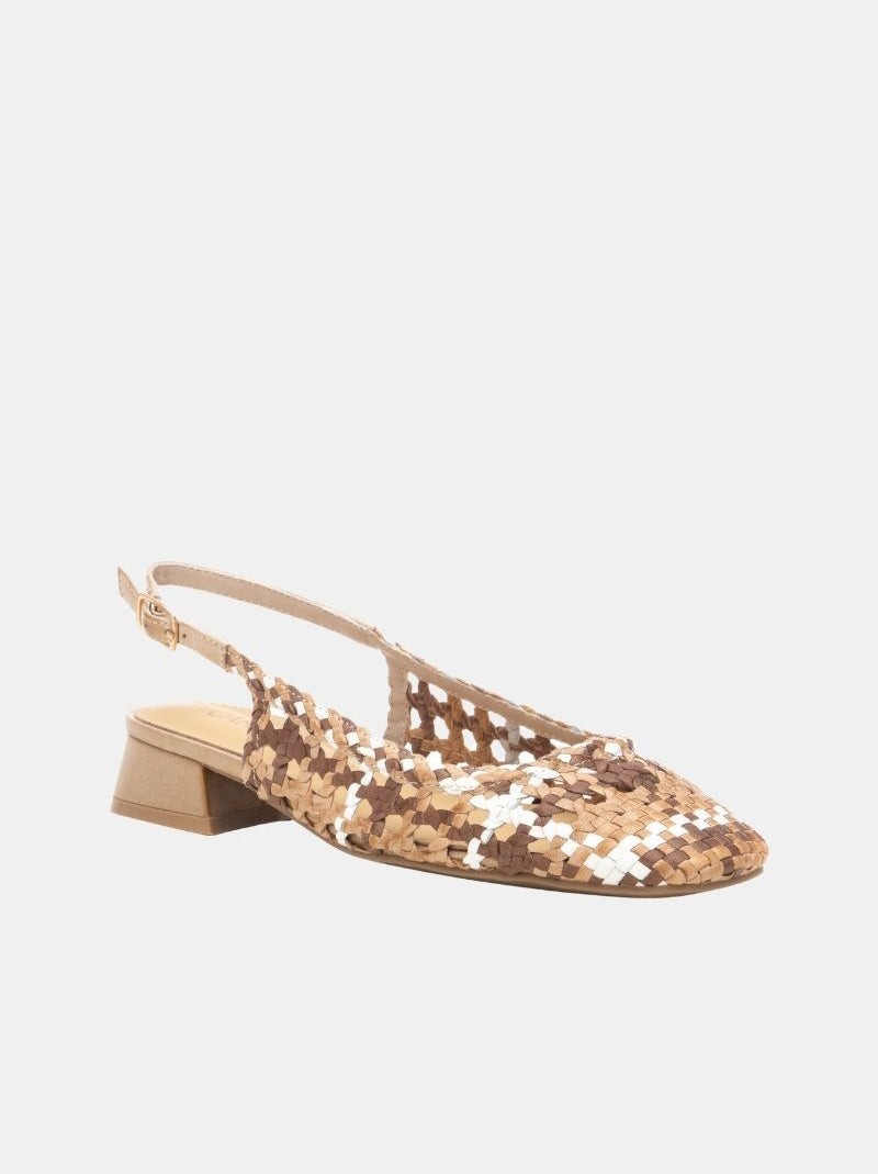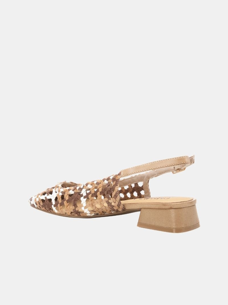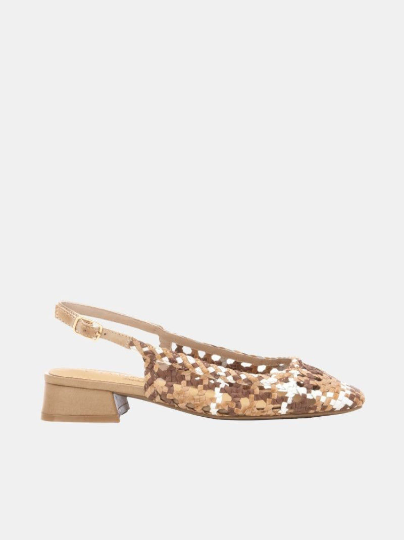 Salón destalonado CARMELA fabricado el piel trenzada combinando colores en tonos BEIGES con puntera cuadrada. Ajuste por tira de tobillo con hebilla y elástico. Plantilla de piel acolchada. Suela de goma con tacón bajo de 3,5cm forrado de piel al tono.