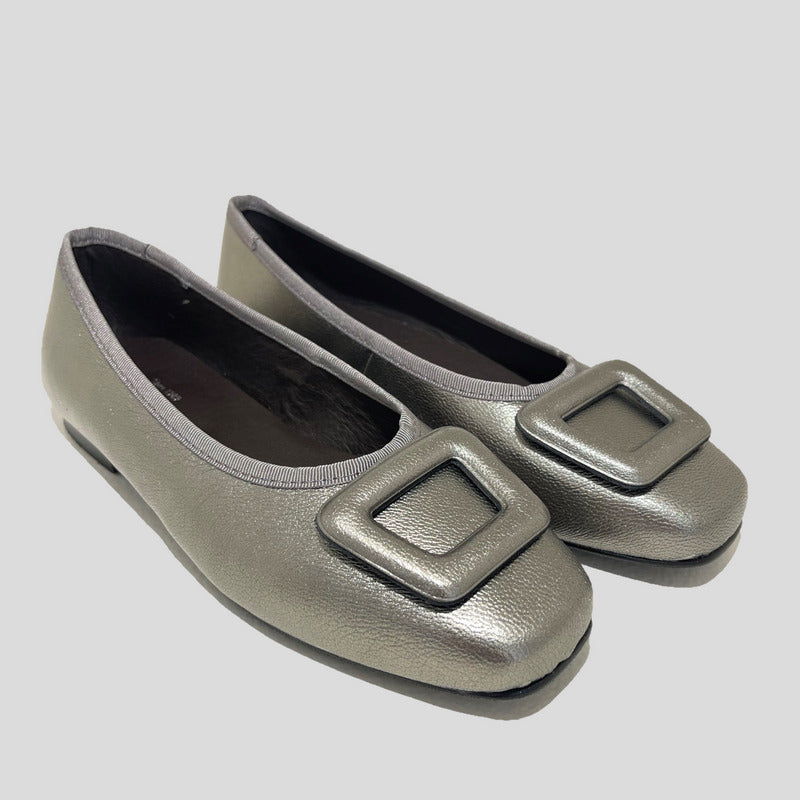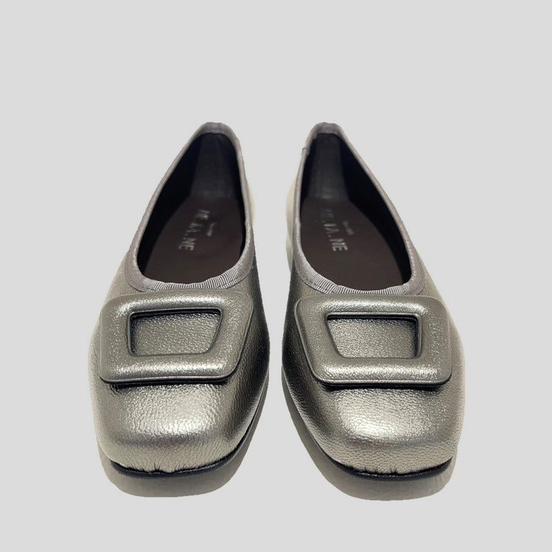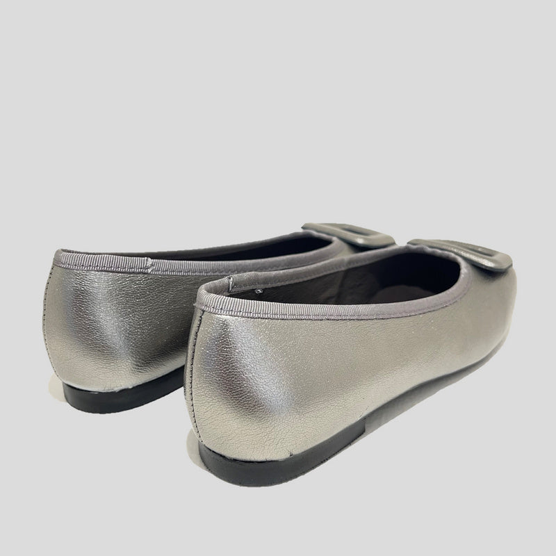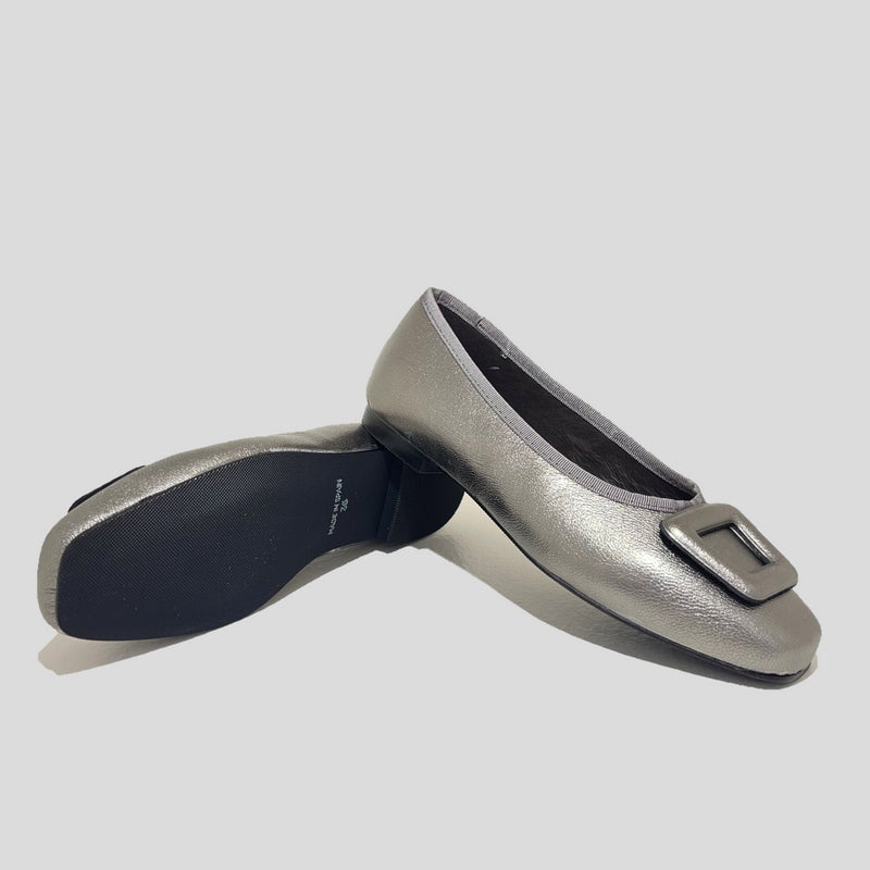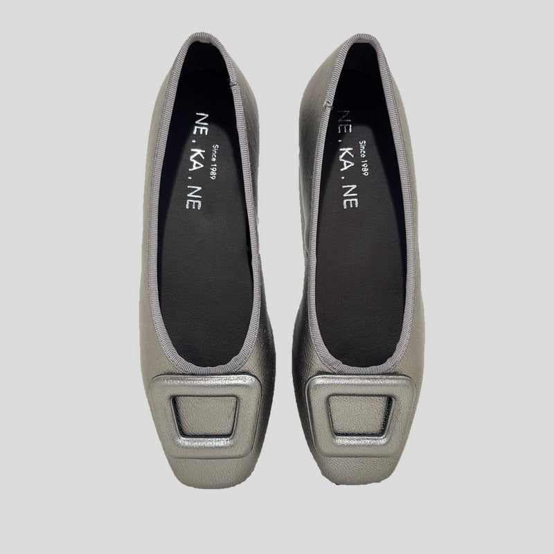 Bailarina plana de NE.KA.NE fabricada en piel metalizada PLOMO con detalle delantero de adorno forrado al tono. Ribete grosgrain al tono. Lleva plantilla interior acolchada, forro de piel y suela de goma antideslizante. Tacón de 1cm.