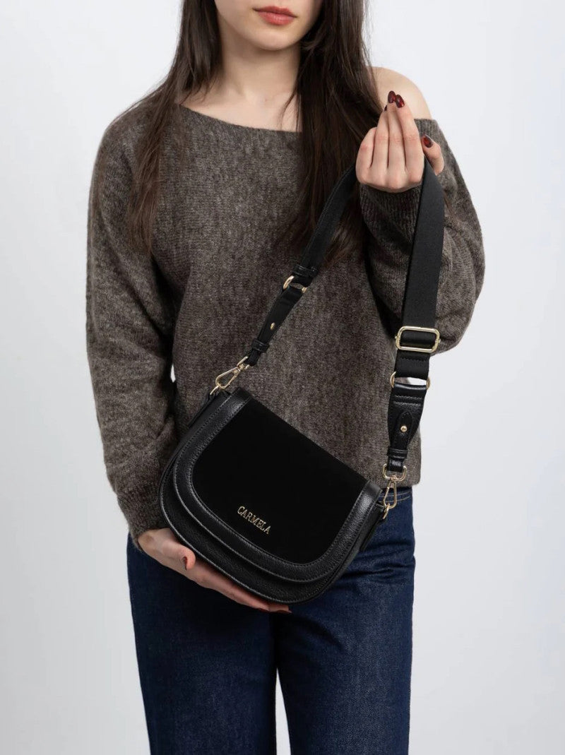Bolso Saddle o bandolera CARMELA color NEGRO en serraje con trasera y detalles en piel. Tapeta con cierre delantero magnético. Lleva bandolera regulable extraíble. Interior forrado con tres compartimentos, dos laterales y uno central con cremallera.