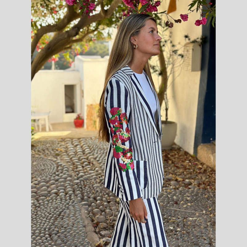 Blazer de VILAGALLO en mezcla de lino y algodón con estampado de rayas asimétricas MARINO y BLANCO. Detalles de flores de lentejuelas bordadas en las mangas. Cierre frontal con botón con flor en relieve metálico. Bolsillos de parche. Forro estampado.