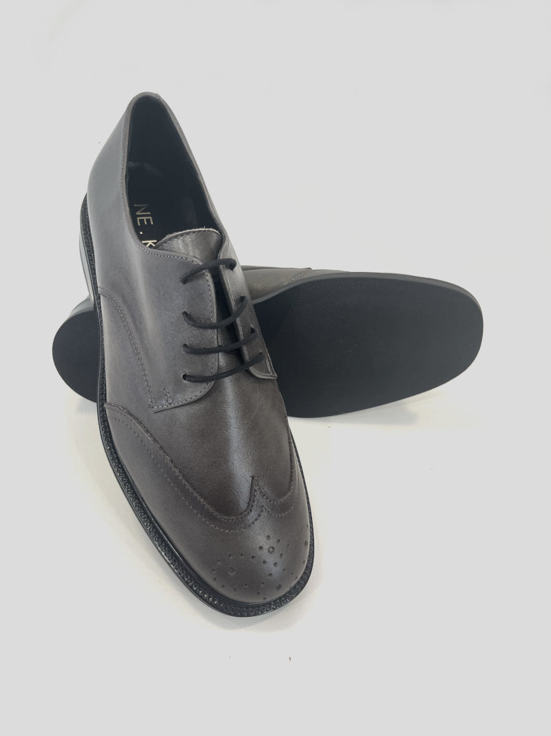 Blucher Mujer Oxford de NE.KA.NE estilo inglés con picado en la puntera fabricado en piel color GRIS. Ajuste por cordones encerados, forro interior en piel y microfibra, plantilla de piel acolchada. Suela de goma antideslizante con tacón bajo de 3 cm.