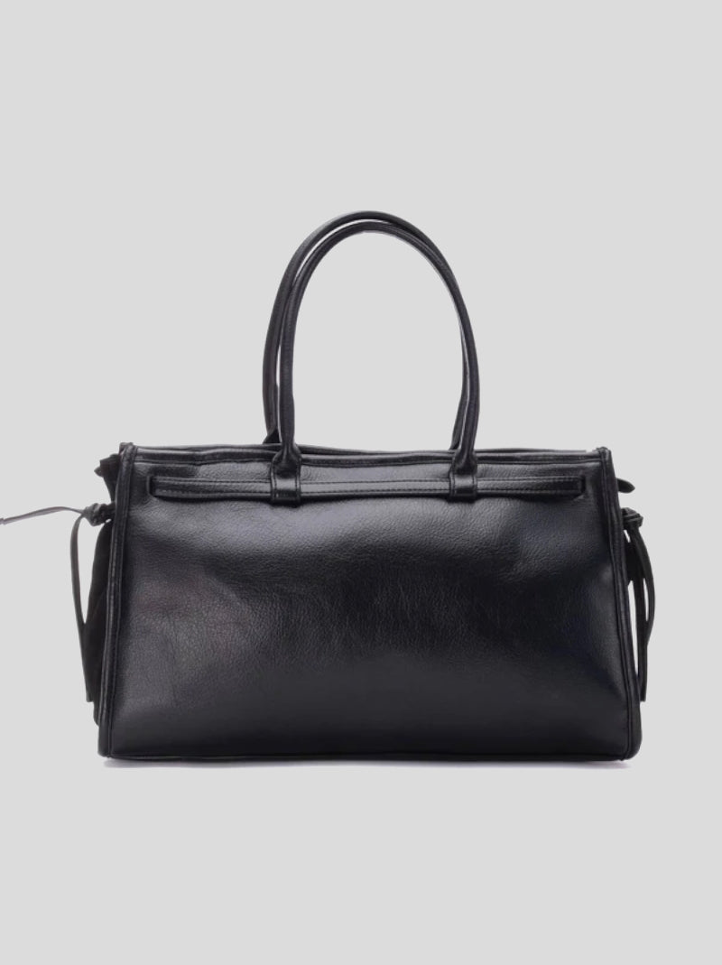 Bolso de hombro CARMELA en color NEGRO fabricado en serraje con trasera en piel y detalle efecto cinturón con hebillas en la parte superior. Lleva dos asas en piel y bandolera regulable extraíble. Cierre superior por cremallera. Bolsillos interiores.
