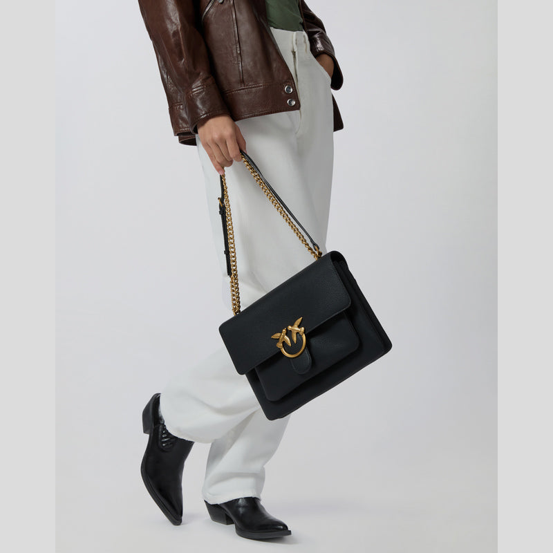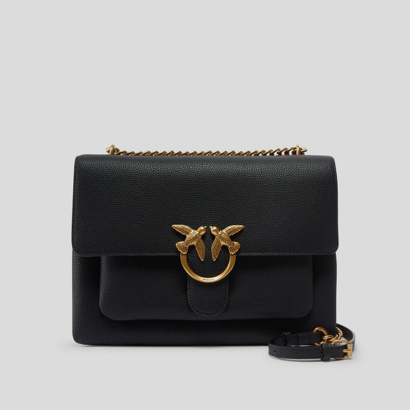 Bolso Bandolera LOVE ONE SHOFT BIG de PINKO realizado en fina piel ABATANADA especialmente suave en color NEGRO. Cierre con hebilla emblemática Love Birds Diamond Cut en DORADO. Interior en algodón con tres compartimentos interiores.